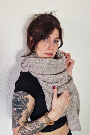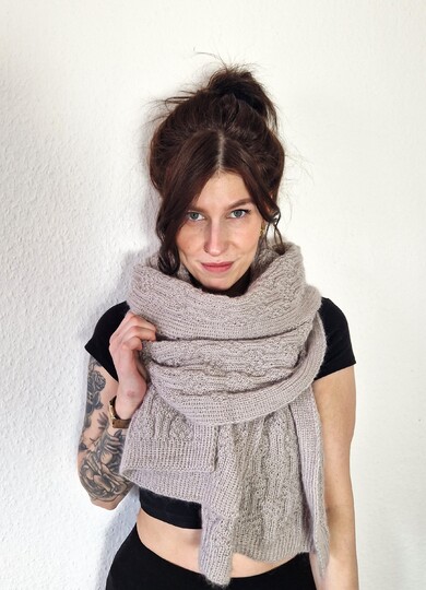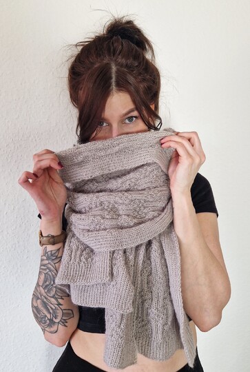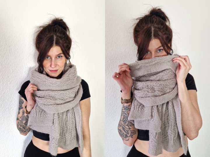Der Schal hat eine Breite von 42 cm und eine Länge von 180 cm.