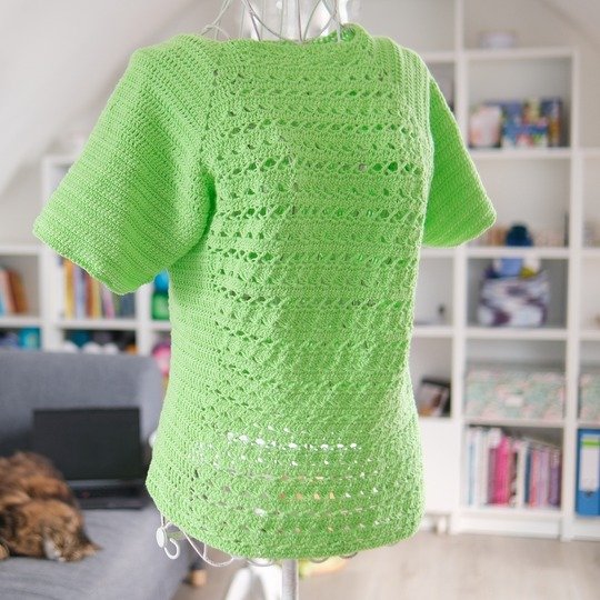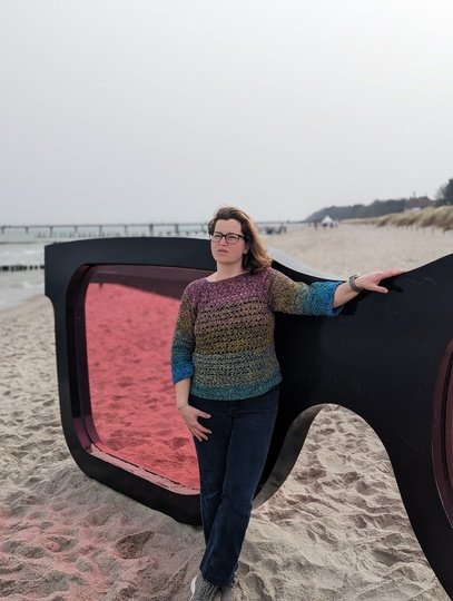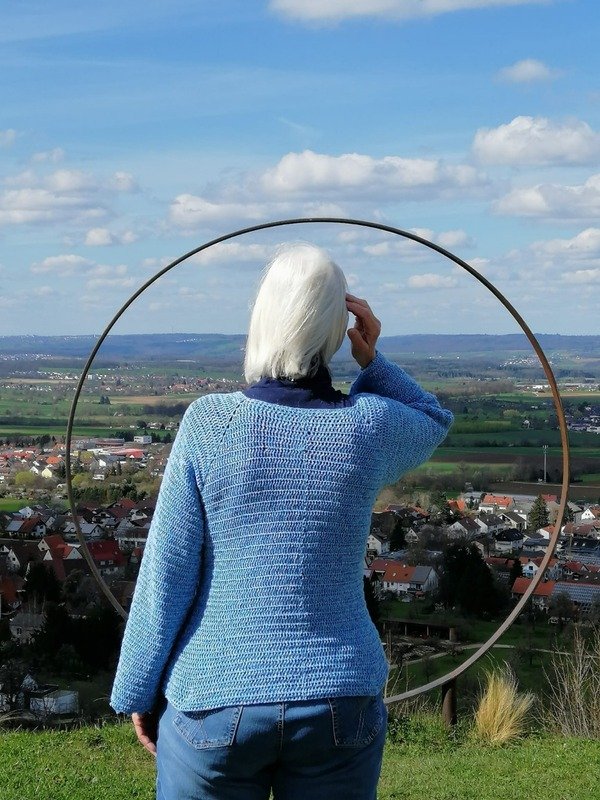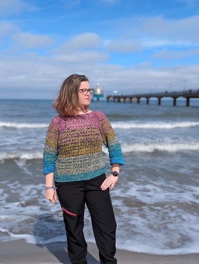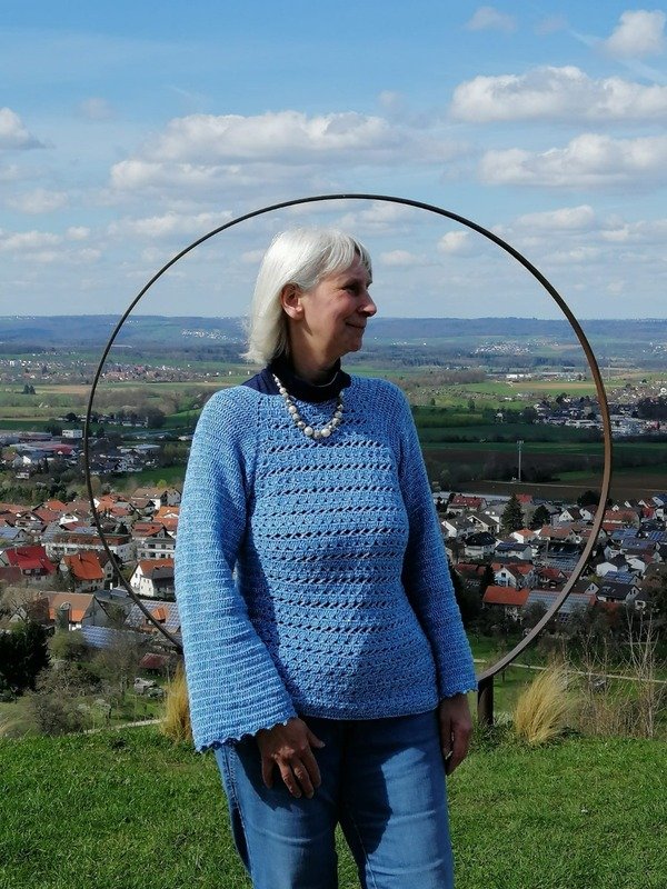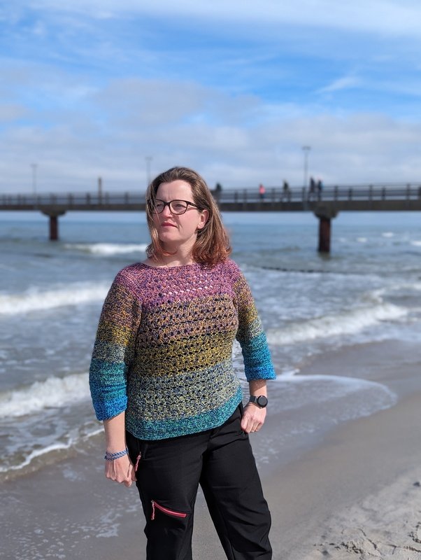 Ich habe meinen Pullover für die Konfektionsgröße 42/44 gehäkelt. Da ich keine ganz so langen Ärmel mag, habe ich mich für 3/4 Ärmel entschieden. Meine Testerinnen haben sowohl die kurzärmelige als auch die Variante mit langen Ärmeln gearbeitet. Gleiche Konfektionsgröße bedeutet nicht gleiche Proportionen.