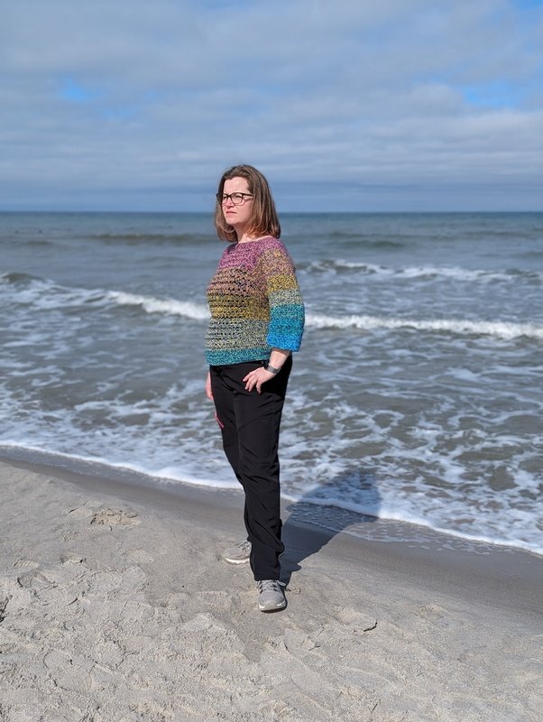 Mein Verbrauch lag bei 1000m + 2x250m für die Ärmel. Verwendet habe ich einen 4fadigen Farbverlaufsbobbel und NS 3,75.