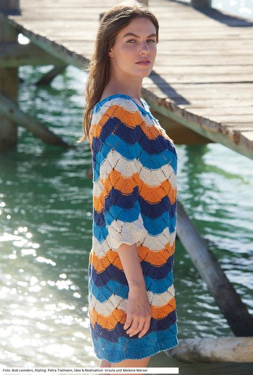 Bei dieser Tunika aus reiner Seide kommt das Wellenmuster durch die Farbstreifen besonders gut zur Geltung. Wir haben intensive Farben von Türkis, über Marine bis Orange und Weiß dafür gewählt. Das Modell mit nahtlos von unten nach oben gearbeitetem Vorder- und Rückenteil und Ärmeln wird dann ab der Passe über alle Maschen gearbeitet mit einer Rundstricknadel. Auf diese Weise erspart man sich das Zusammennähen. Die Säume haben ein 1/1-Rippenmuster, der Halsausschnitt wird mit einem I-Cord verziert. Die Anleitung hierfür steht für die Größen 38/40 und 46/48 zum Download bereit.