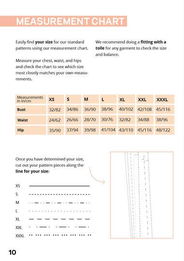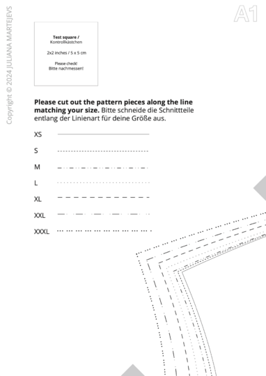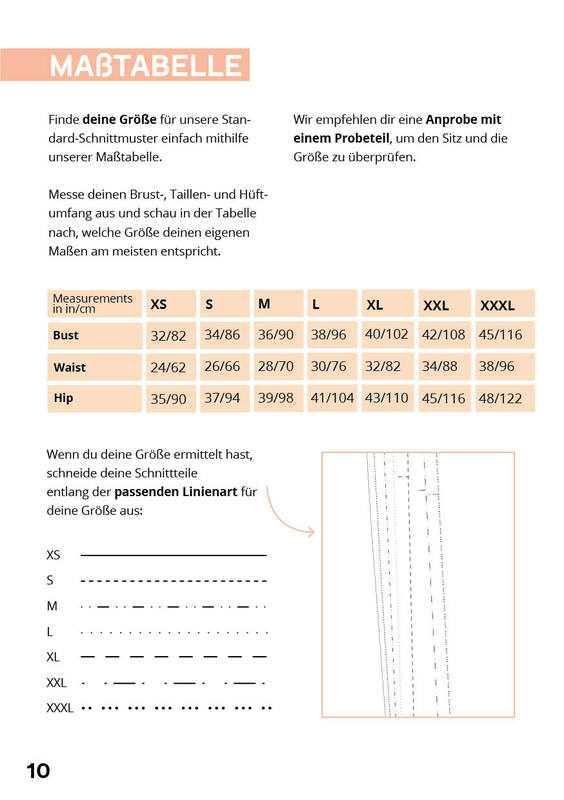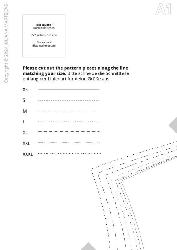 Die Größen XS-XXXL sind als Schnittmuster enthalten. Die genauen Maße der Größen könnt ihr der Größentabelle in den Bildern entnehmen. Als Referenz: Unser Model Dayami ist 175cm groß und trägt Größe XL.