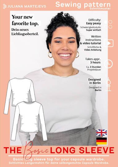 Einfaches Langarmshirt Schnittmuster zum Oberteil selber nähen. Mit kostenloser Video Nähanleitung auf unserem YouTube-Kanal JULIANA MARTEJEVS - Das DIY-Modelabel oder julianamartejevs. com
