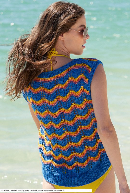 Dieses kurze Top lebt vom Kontrast zwischen dem kraftvollen Blau des Zackenajourmusters und den sonnenverwöhnten Wellen (kraus rechts) in Orange und Gelb. Da entsteht direkt Strand-Feeling. In der kühleren Jahreszeit lässt sich dieses Modell auch gut über einer Bluse als Pullunder tragen. Der kastige Schnitt wird noch betont durch den eckigen Halsausschnitt. Alle Bündchen und die Ausschnittblende werden im 1/1-Rippenmuster gearbeitet. Sehr angenehm auf der Haut ist das Garn aus einer Mischung von Viskose, Baumwolle und Leinen. Die Anleitung dazu gibt es für die Größen 36/38, 42/44 und 48/50.