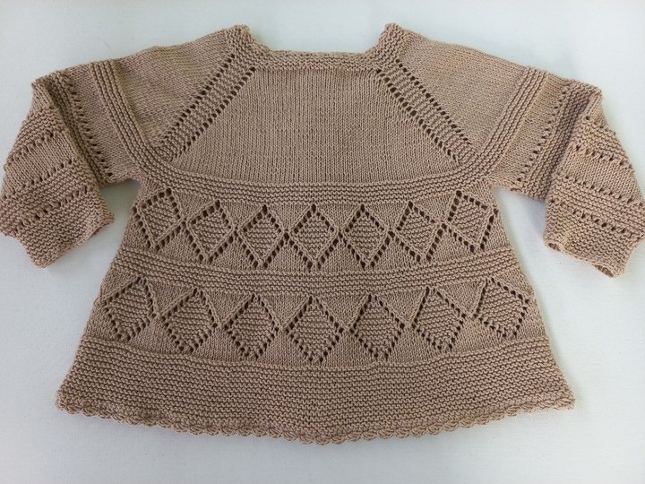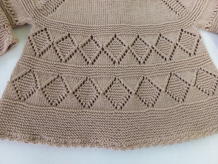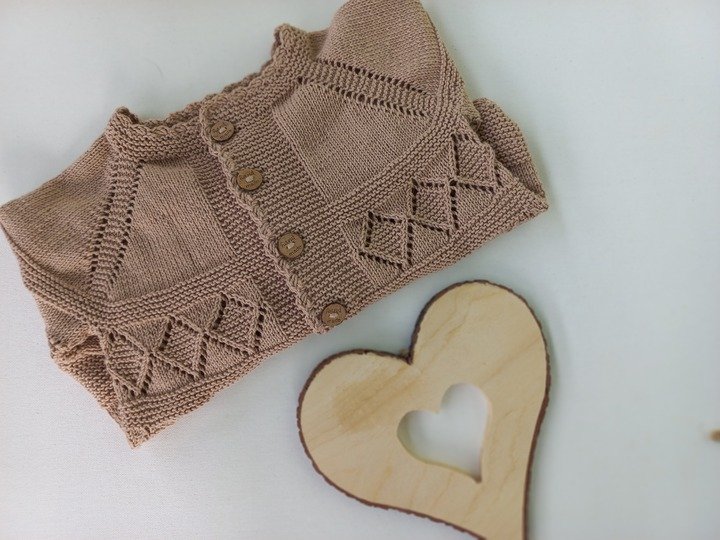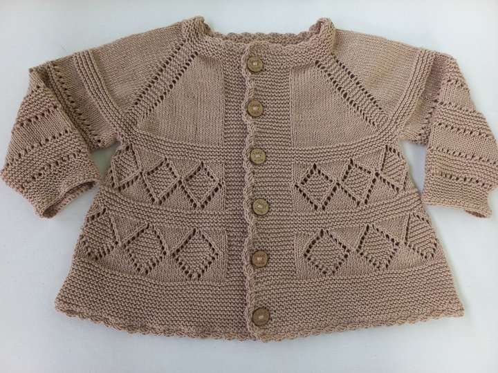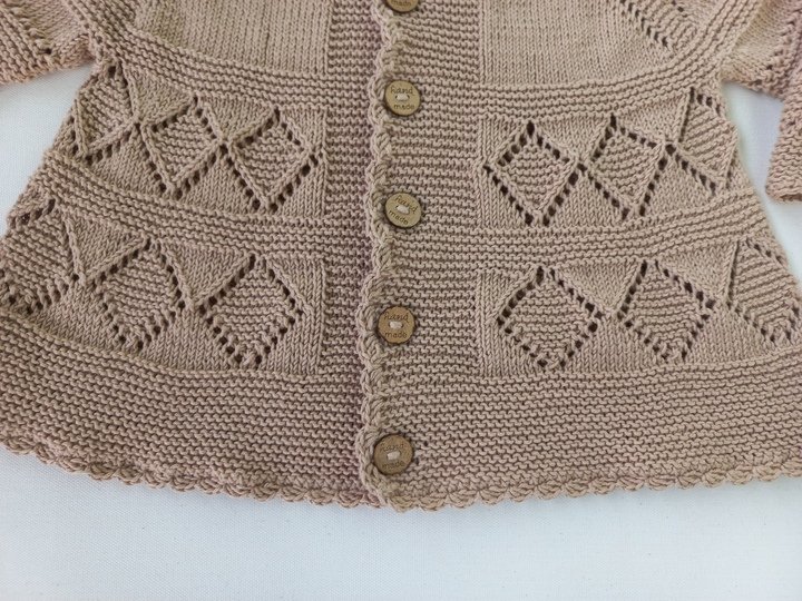 Hier bekommst du eine bis ins kleinste Detail erklärte 19-seitige Strickanleitung in deutsch für eine wunderschöne Babyjacke/Mädchenjacke mit einem tollem Lochmuster.