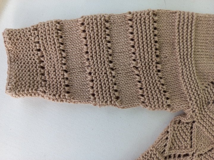 Das Lochmuster sowie die Raglanzunahmen habe ich jeweils in einer Tabelle - Reihe für Reihe - aufgelistet. Man muss also nur der Tabelle nachstricken ohne langes Messen, Rechnen oder Umsetzen einer Strickschrift.