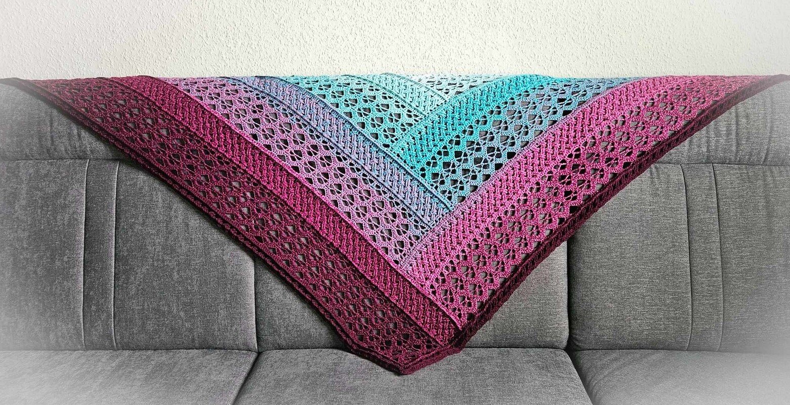 Das am Titelbild gezeigte Tuch hat folgende Abmessungen: 185 x 85 cm. Das Tuch kann in jeder beliebigen Größe gehäkelt werden, da sich die Reihen wiederholen.