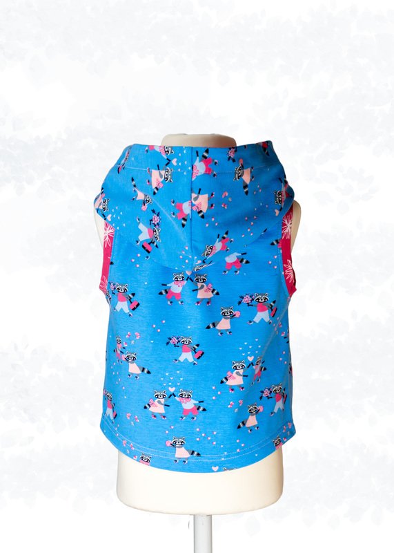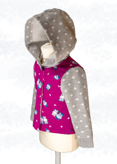 Für kalte Jahreszeiten eignen sich Alpenfleece oder Nikkiplüsch als Stoffe. Für wärmere Monate kann sie gut aus leichten Steppjersey oder mittelschwerer Jerseyware genäht werden. Die Kapuze ist ungefüttert, wodurch die flauschige Rückseite von Alpenfleece für eine besondere Optik sorgt.