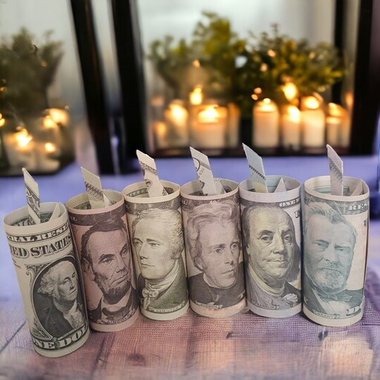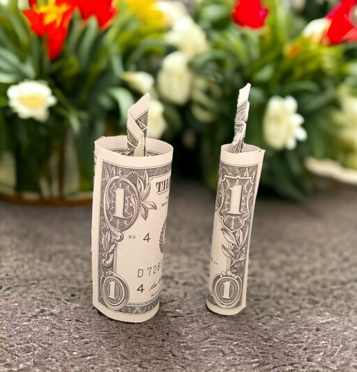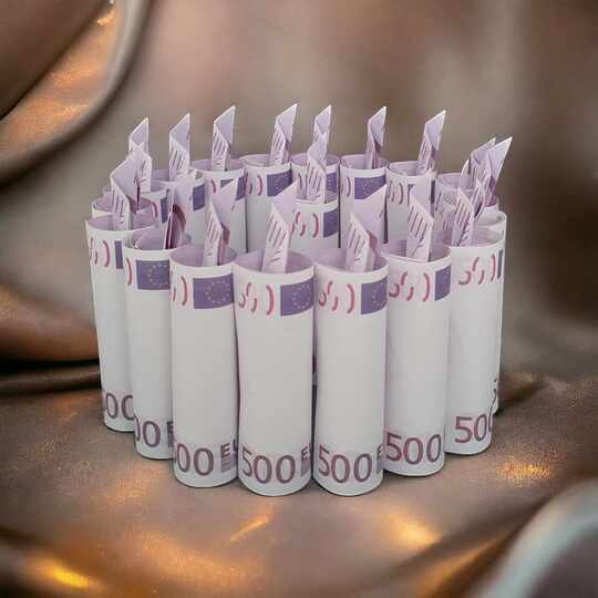 Diese dreidimensionale Origami Geldschein-Kerze ist aus einem Geldschein gefaltet. Die 3D-Kerze kann auch als 2D-Kerze gefaltet werden. Sie kann aus jedem Euro Geldschein oder jeder anderen Währung gefaltet werden. Auf dem Foto ist sie aus Euro-Geldscheinen und US-Dollar-Geldscheinen gefaltet.