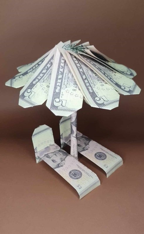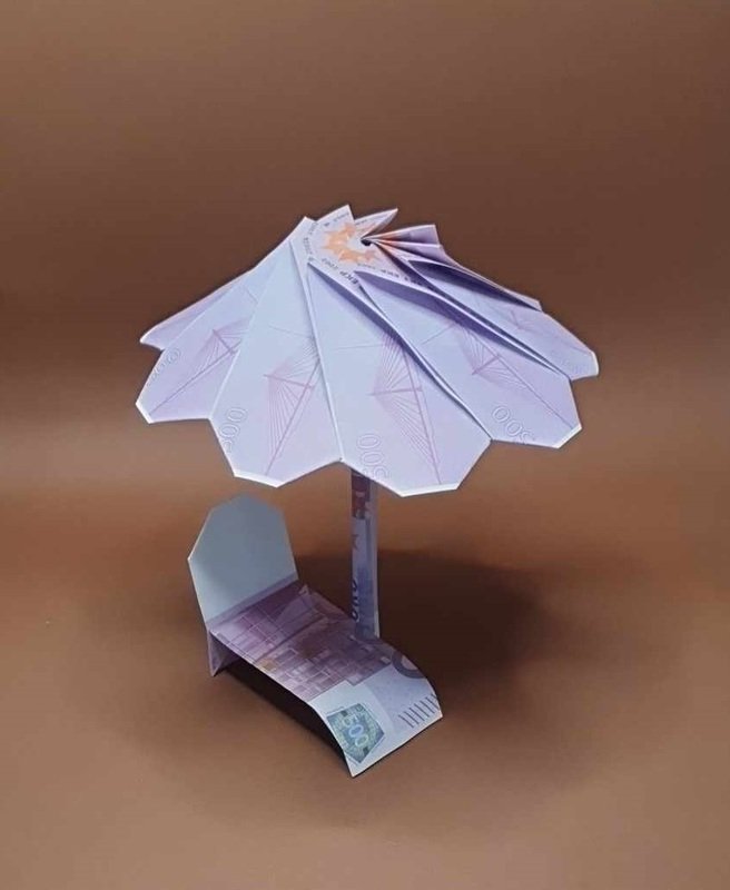 Der dreidimensionale Origami-Geldschein-Sonnenschirm wird aus 8 bis 11 Geldscheinen gefaltet. Einer der 8 bis 11 Geldscheine ist der Sonnenschirmständer. Die Sonnenliege wird aus einem Geldschein gefaltet.