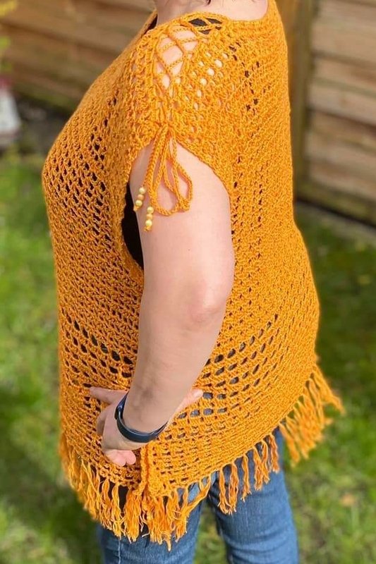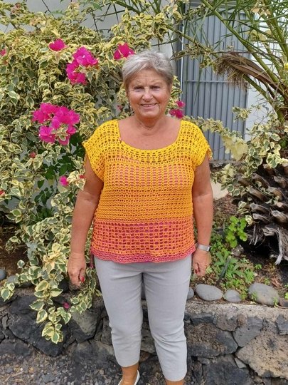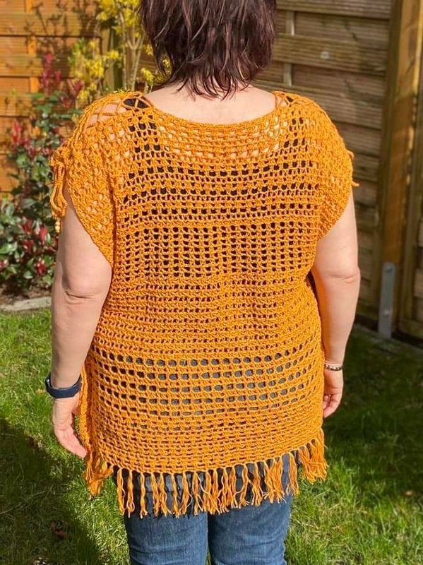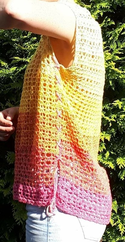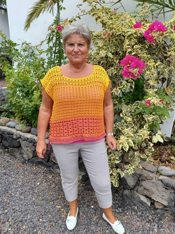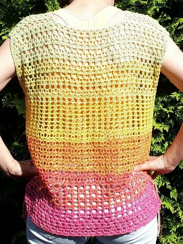 Dieses Top ist flott gehäkelt und kann ganz individuell gestaltet werden. Wähle eine Farbe, die gut zu Deinem Typ passt, trage ein einfaches Top darunter und Du bist wunderschön figurschmeichelnd angezogen. Ich hoffe natürlich, dass sie Dir auch so viel Freude macht wie mir.