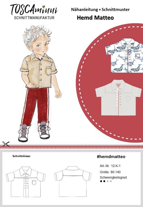 Mit dem Schnittmuster Matteo nähst Du ein sportliches Hemd für Jungs mit einem Haifischkragen, Passe und sportiven Ärmelaufschlägen. Das Hemd ist leger und gerade geschnitten. Der Schnitt ist etwas aufwendiger zu nähen, alle Nähschritte sind jedoch nähanfängerfreundlich aufbereitet.