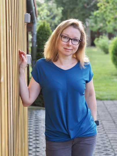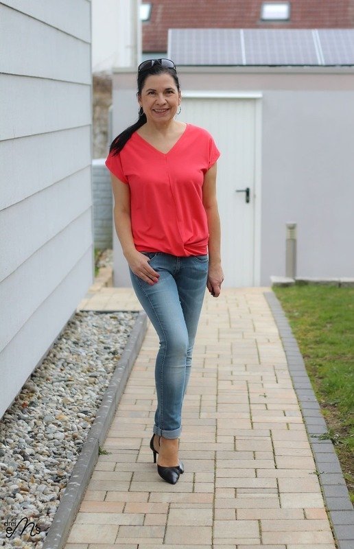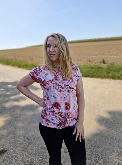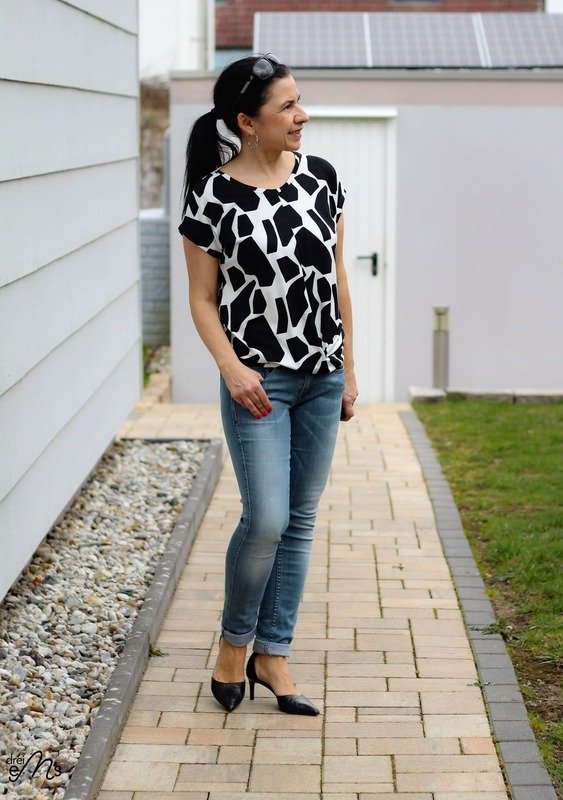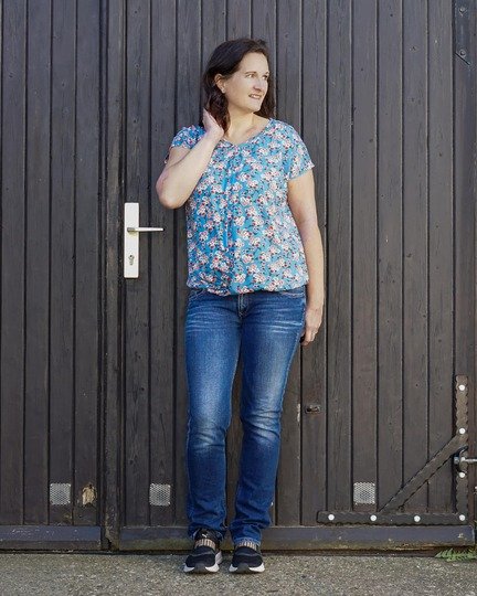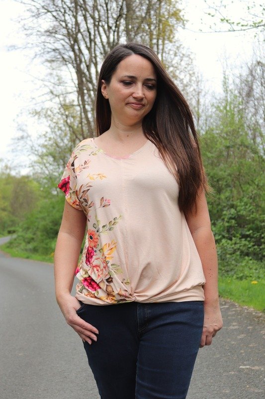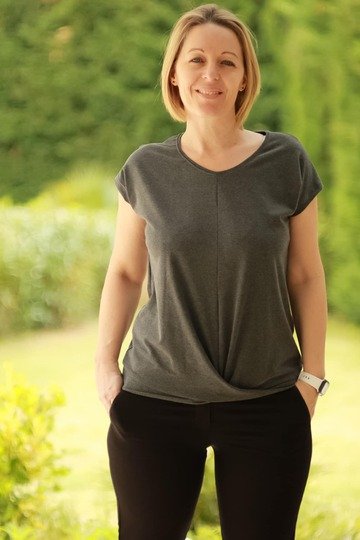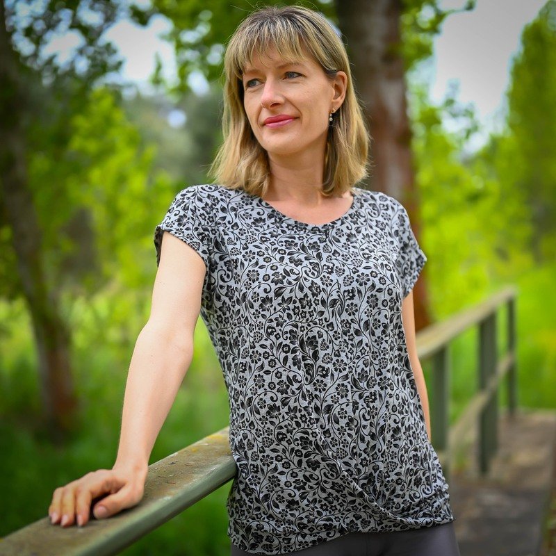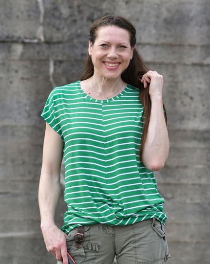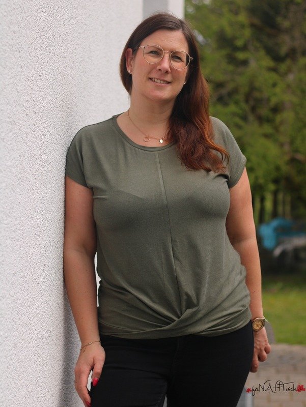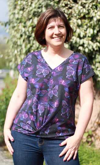 ATTING bekommst du in den Größen 34-54. Der Schnitt enthält zwei Längen, einen Rundhalsausschnitt und einen V-Ausschnitt. Im Vorderteil wird das Shirt am Saum mit einem Twist genäht.