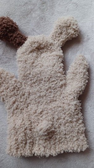 1 - 2 (je nach Größe) Knäuel Frottee-Wolle in braun (ich habe Baby Smiles von Lenja Soft in der Farbe Teddy verwendet) für den Handschuh