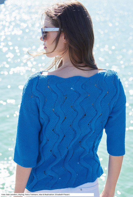 Der kastig geschnittene Pullover mit dreiviertellangen Ärmeln strahlt in einem kraftvollen Enzianblau. Das Wellenmuster erzeugt Assoziationen an einen Urlaub am Meer. Das senkrechte, dynamische Wellenmuster kommt durch das zurückhaltende Perlmuster zwischen den Zacken hervorragend zur Geltung. Vorder- und Rückenteil sind einfach zwei Rechtecke, bei den ganz im Perlmuster gearbeiteten Ärmeln wird nach oben hin zugenommen. Alle Bündchen sind kraus rechts gestrickt. Eine Anleitung für dieses Modell aus Baumwolle mit ein wenig Polyester-Beimischung steht in den Größen 36/38, 42/44 und 46/48 zur Verfügung.
