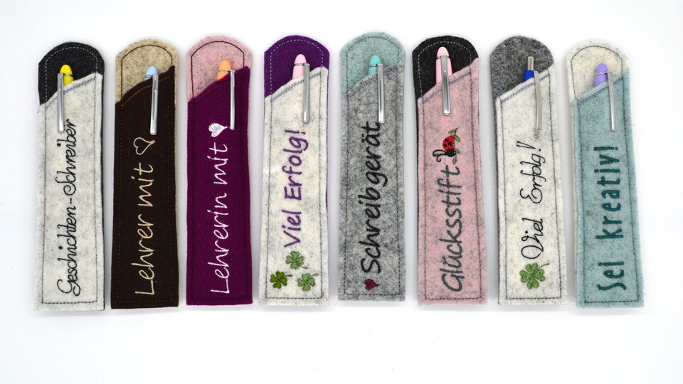 Sie sind schnell gestickt und zusammen mit einem neuen Stift eine schöne Geschenkidee und Kleinigkeit zum Mitbringen. Ihr benötigt hierfür einen Filz oder Kunstleder in der Stärke von 1mm.