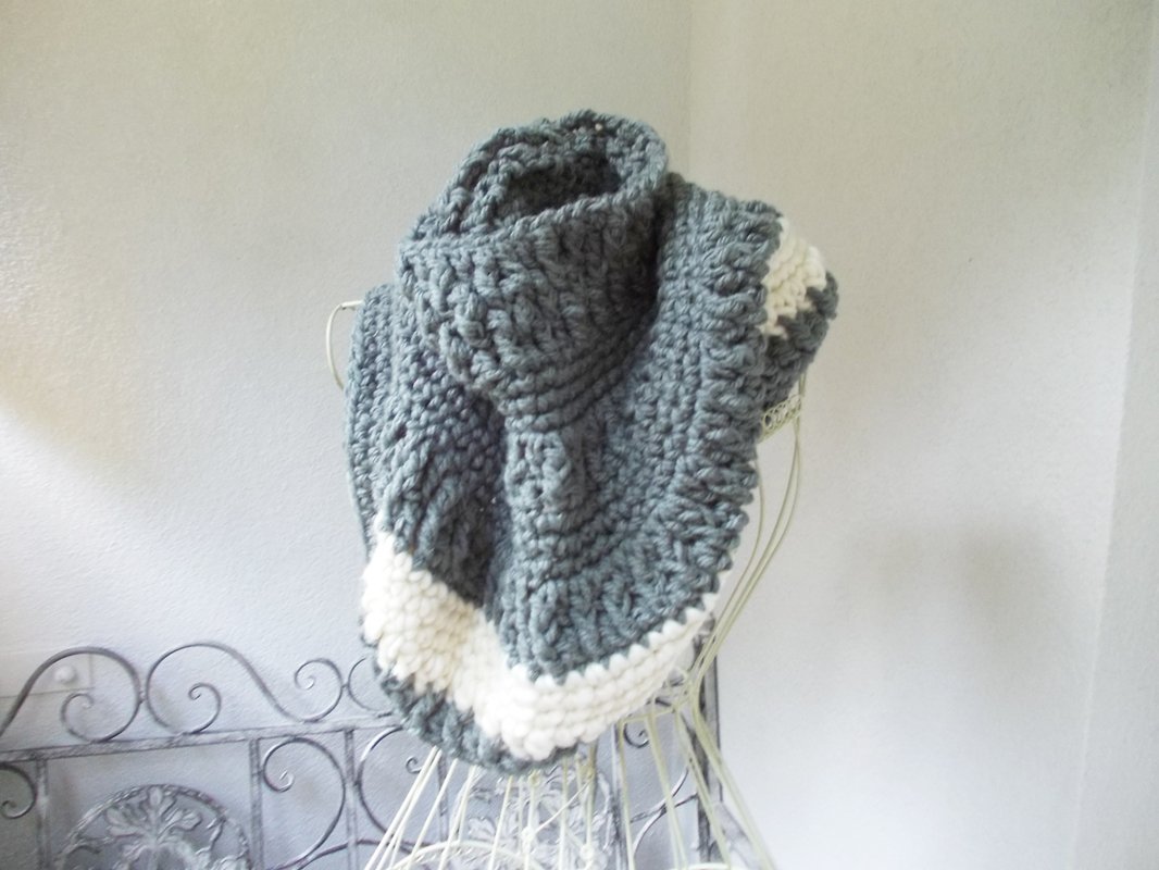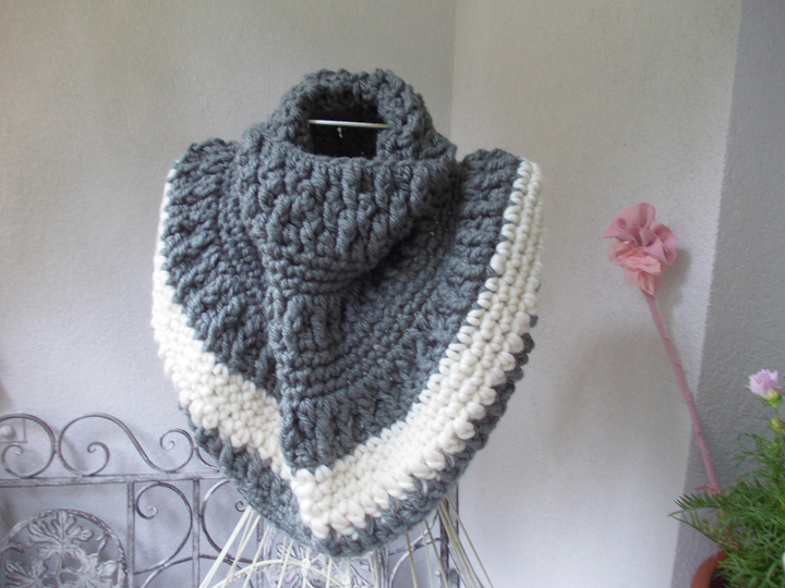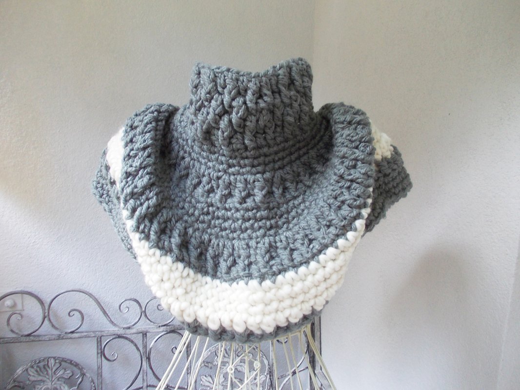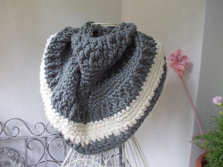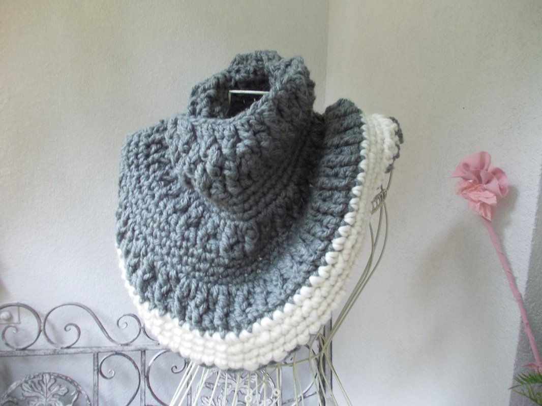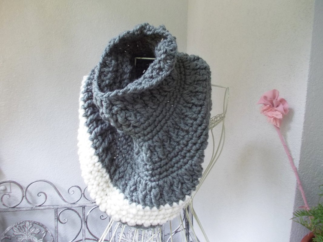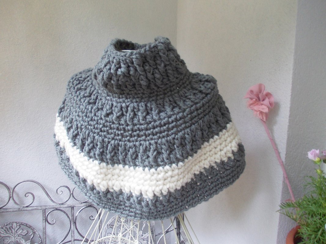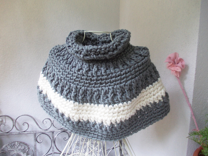 Die Anleitung (pdf-Datei 505 KB) mit Hinweisen für Material, Menge, Zubehör und auf 9 Seiten mit 41 Arbeitsbildern erklärt, ist so aufgebaut, dass ich beschreibe, wie ein "kleiner Halswärmer", der Poncho wie abgebildet und größer/länger gehäkelt werden kann. Auch Anfänger sollten sich trauen.