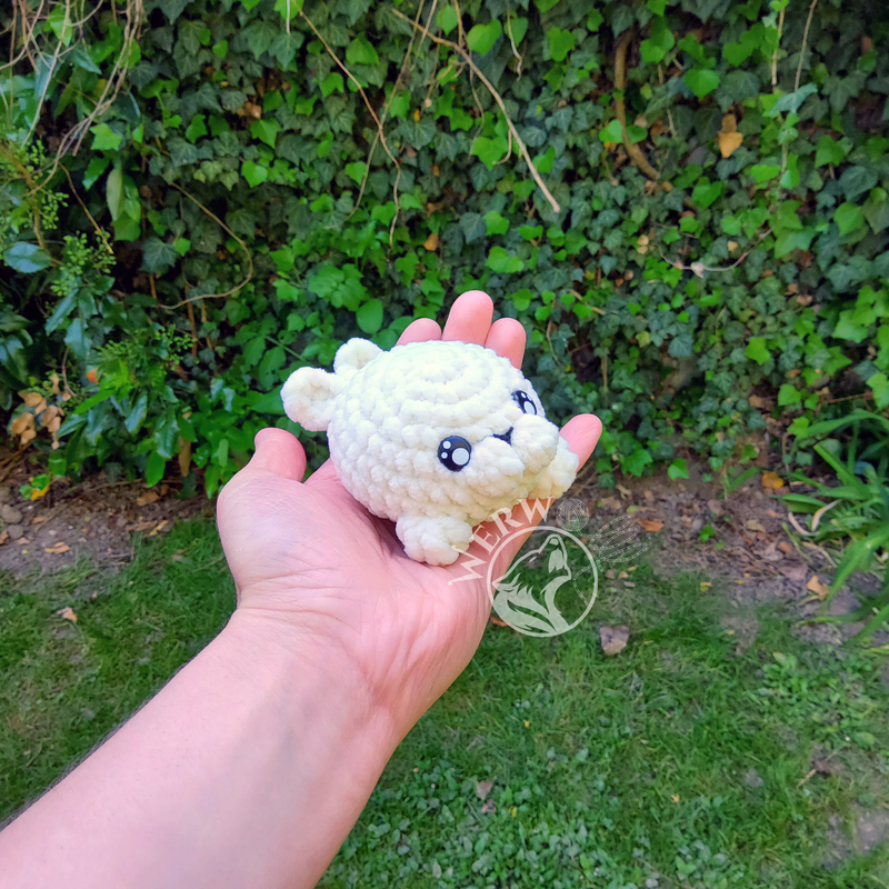 Die Größe variiert je nach verwendetem Garn und Häkelnadel. Ich habe eine 4 mm Häkelnadel verwendet und mein Baby Seehund ist ungefähr so groß wie meine Handfläche geworden.