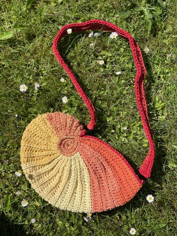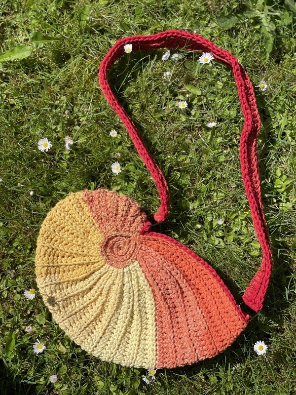 Material: Woolly Hugs ROPE BOBBEL (80% Baumwolle, 20% Polyester, Lauflänge ca. 210m/250g) von Langendorf & Keller : 1 BOBBEL Orange-Töne Color (Farbe 10S9) 1 Häkelnadel Nr. 5,5 – 6,5 2 Rechteckringe 40 x 20 mm