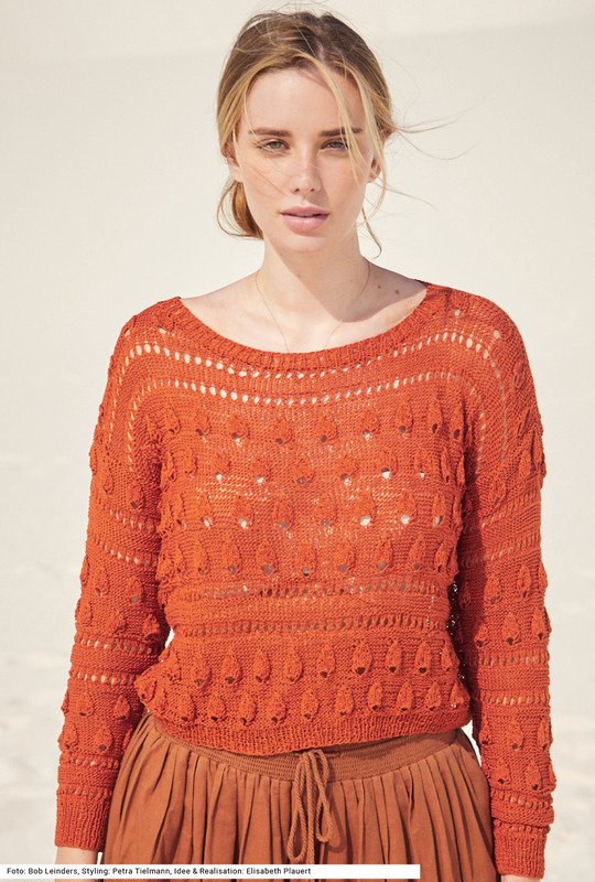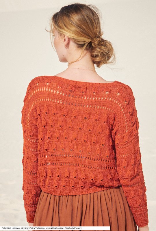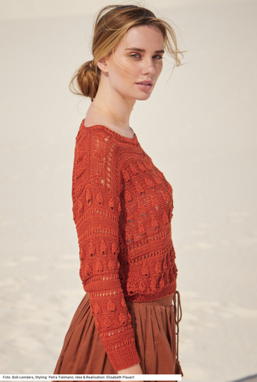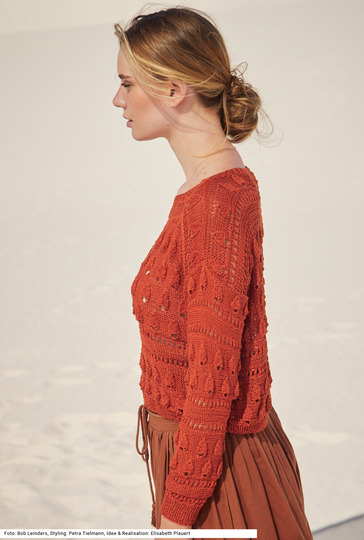 Ein gleichmäßig aufgereihtes Blattmuster, dazwischen Lochstreifen sowie glatt rechts und glatt links gearbeitete Streifen sorgen für Abwechslung beim Stricken. Dieser modisch kurz geschnittene Pulli mit langen Ärmeln wird aus einem Baumwoll-Bändchengarn gestrickt, das einen seidigen Glanz hat. Das gibt dem an sich recht kernigen Modell einen eleganten Twist. Die Blende am weiten runden Halsausschnitt und alle Bündchen sind im 1/1-Rippenmuster gearbeitet. Gerade Armausschnitte erleichtern das Einnähen der Ärmel. Die Anleitung dazu gibt es für die Größen 36/38, 40/42 und 44/46.
