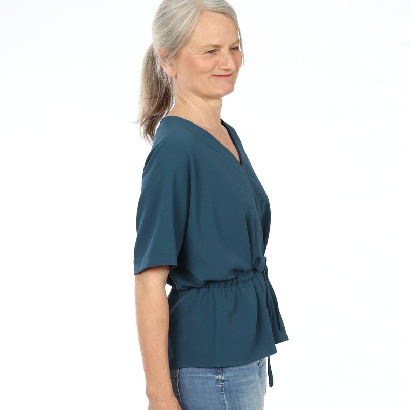 FRAU YUUKA ist eine legere Bluse ohne Schulternähte mit kurzen Fledermausärmeln und V-Ausschnitt. Durch das Gürtelbändchen betont sie trotz ihrer entspannten Weite die Taille. Der diagonale Fadenlauf erzeugt einen V-Effekt an der vorderen und hinteren Mitte, der besonders bei gestreiften Stoffen schön zur Geltung kommt.