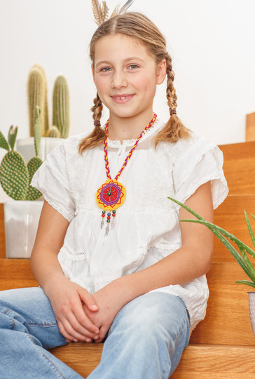 Der Kettenanhänger wird aus verschiedenenfarbigen Resten eines Baumwollgarns gehäkelt. Nach der Fertigstellung wird der Anhänger noch mit kontrastfarbigen, sternförmig angeordneten Spannstichen sowie Zickzacklinien bestickt und mit verschiedenfarbigen Perlen und Federn verziert. Die Kette für den Anhänger entsteht aus drei Luftmaschenketten, die zu einem Zopf geflochten werden.