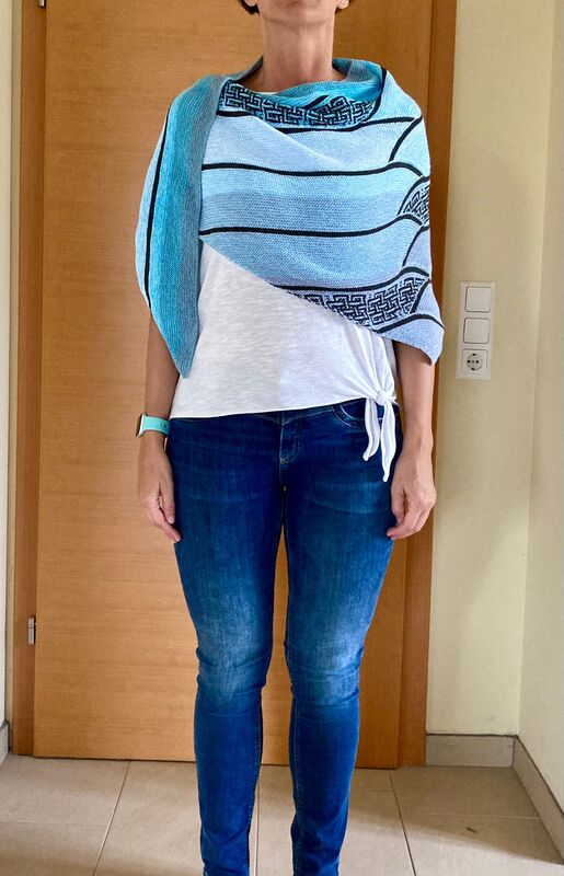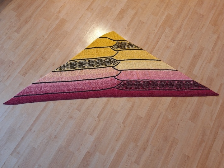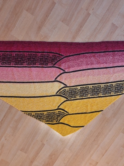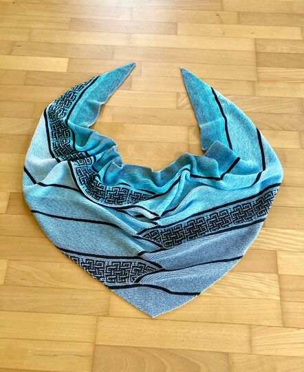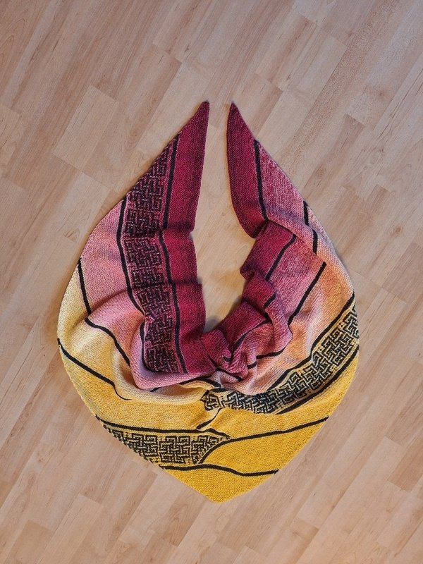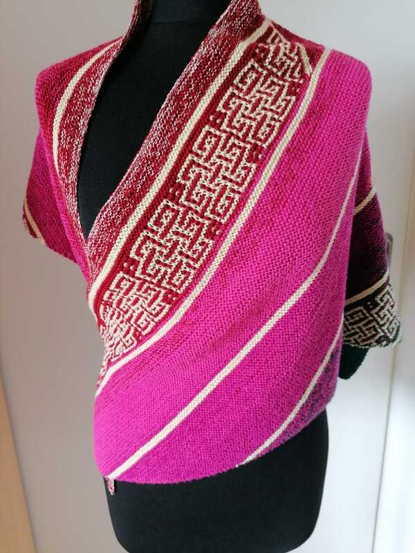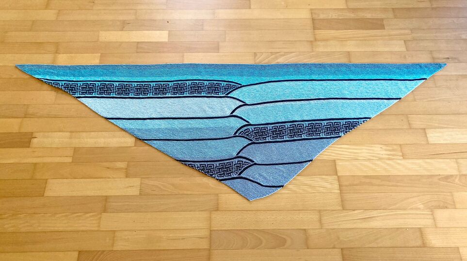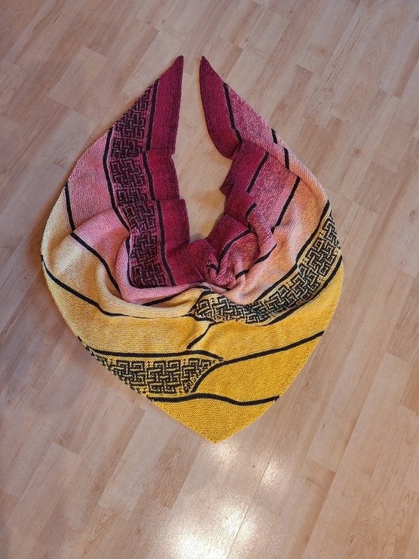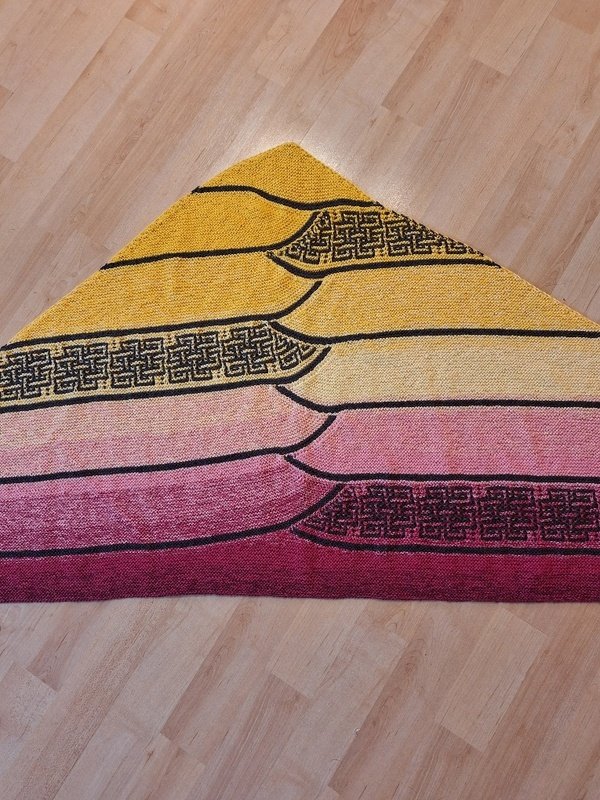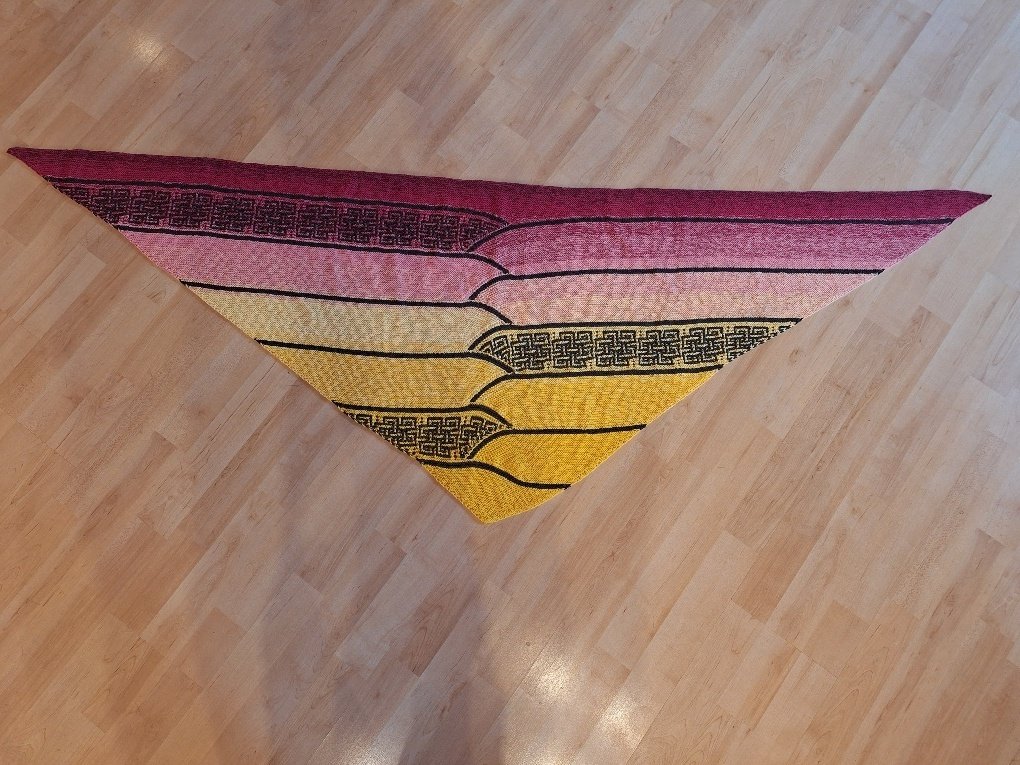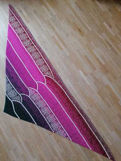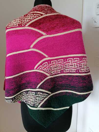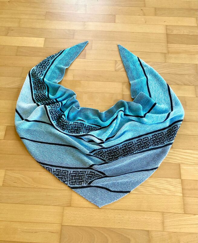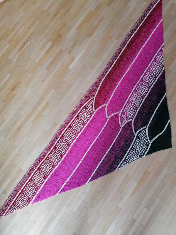 Es ist ein gleichschenkeliges Dreieckstuch mit verkürzten Reihen und Hebemaschenmuster.