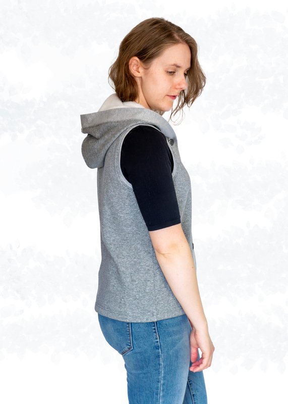 Das Modell “Daria” ist eine Sweatjacke bzw. Sweatweste mit einer dekorativen Blende und Kapuze. Die Jacke/Weste ist hüftumspielend und kann mit verschiedenen Verschlüssen genäht werden, wie Knopf- und Knopfloch, Druckknöpfe oder Klettverschluss. Sie ist anfängerfreundlich, da sie keine Reißverschlussverarbeitung hat.
