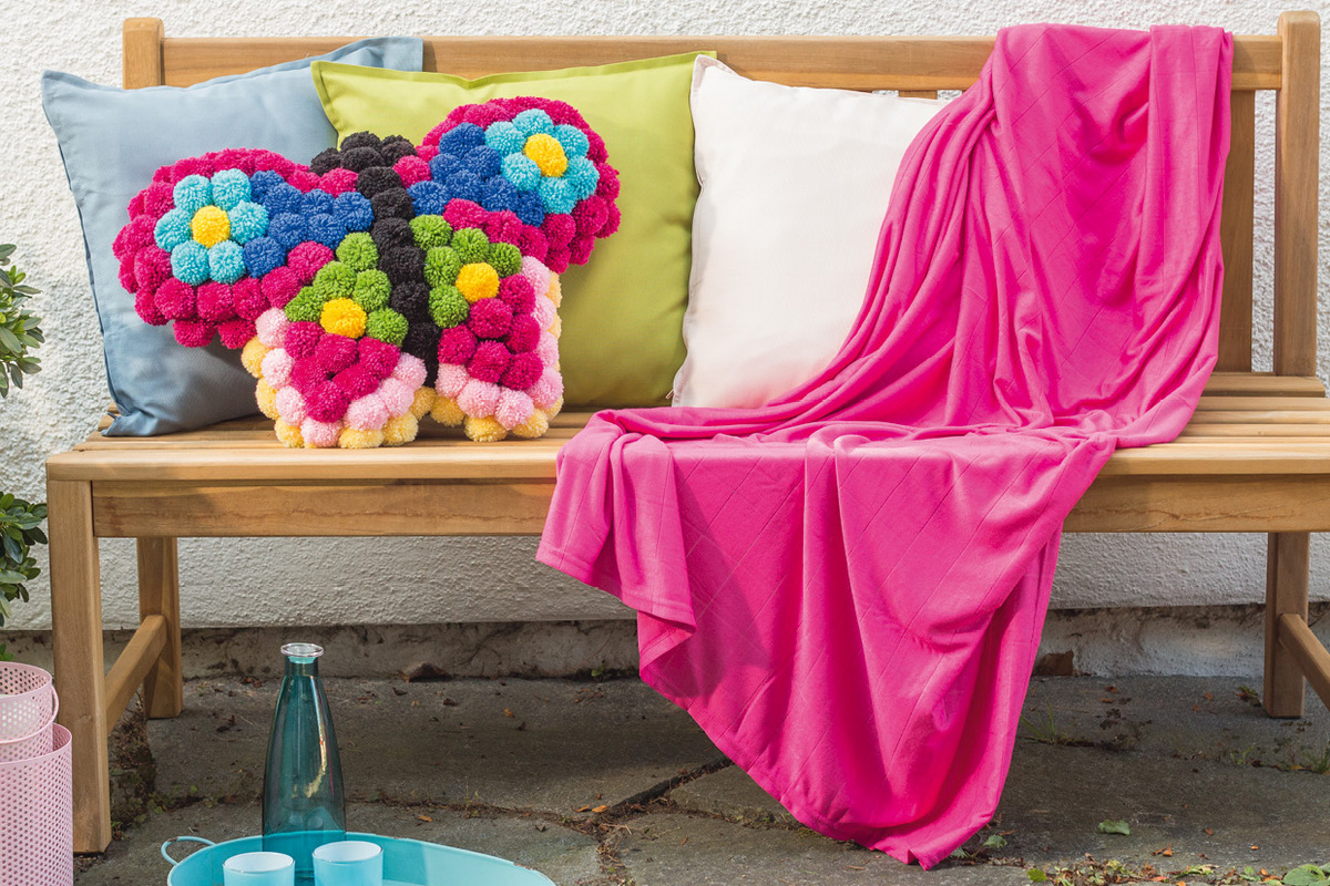Dieses kunterbunte Kissen in Schmetterlingsform wurde komplett mit Pompons in leuchtenden Farben gestaltet. Das ist sicher eine kleine Fleißarbeit, die sich aber sicherlich lohnt. Pro Wollfarbe werden dafür Pompons von 45 mm Ø in der Anzahl wie in der Farbskizze angegeben angefertigt. Vorder- und Rückseite werden dann verstürzt und vor dem Schließen der Wendeöffnung mit Füllwatte befüllt. Die Pompons werden wie in der Skizze zu sehen angeordnet und auf die Kissenvorderseite genäht oder mit geklebt.