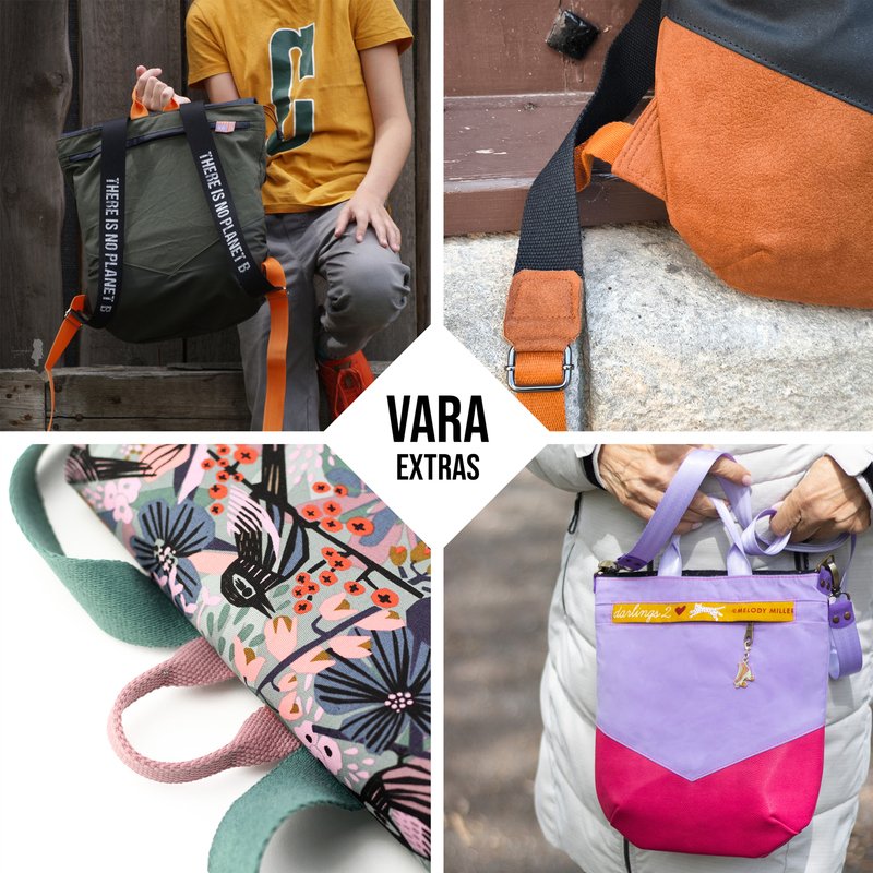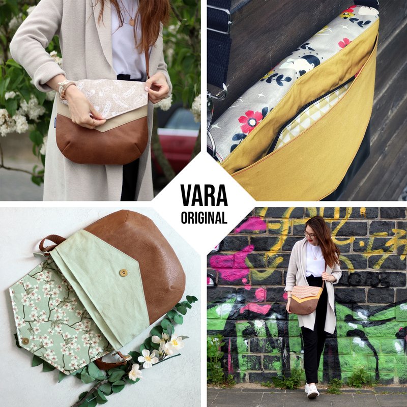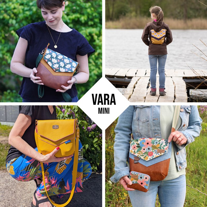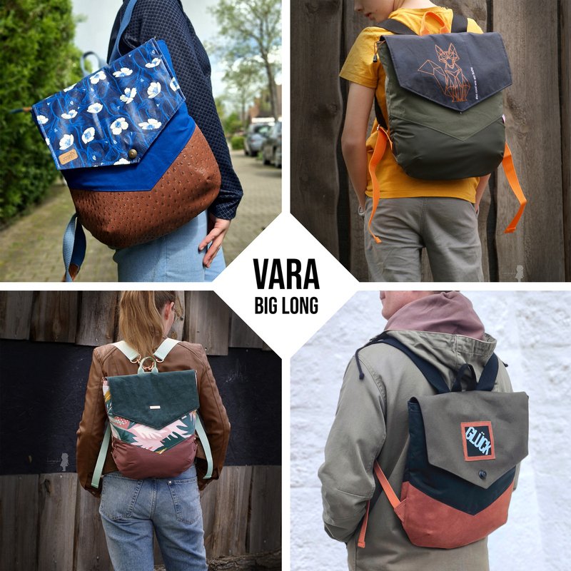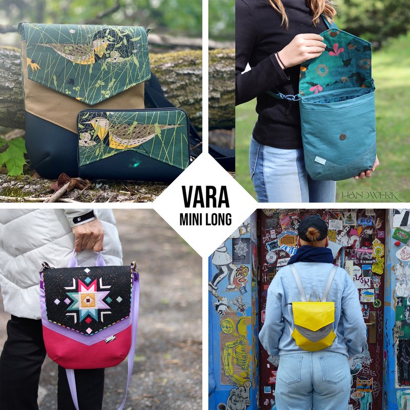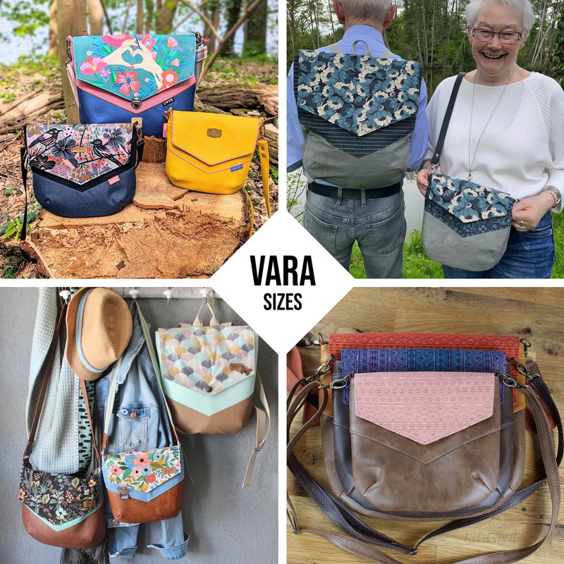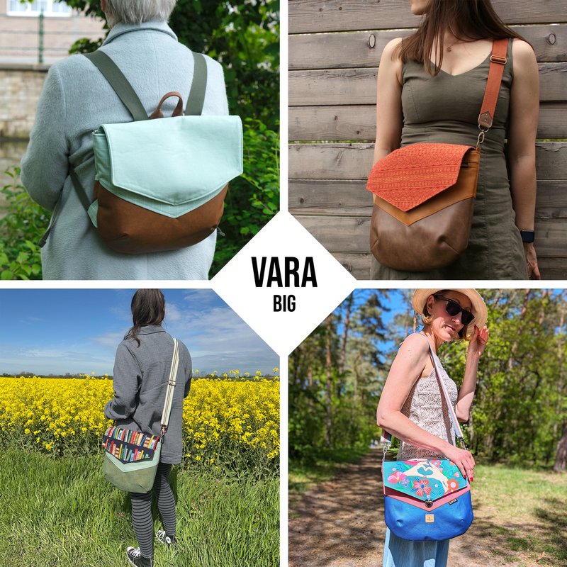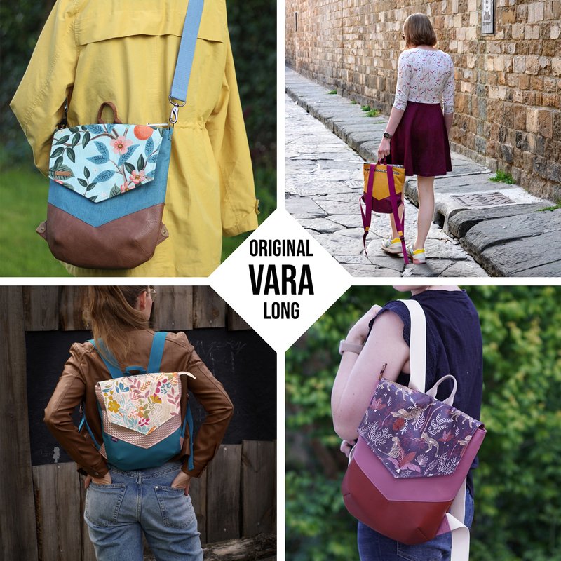 Das VARA Add-On beinhaltet außerdem Schnittmuster für zwei weiteren Größen der Tasche VARA: Mini & Big. Vara Mini misst ca. 22cm x 26cm und Vara Big misst ca. 32cm x 38cm. Alle drei VARA Größen kannst du mit diesem Add-On verlängern und als Rucksack tragen.