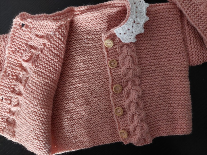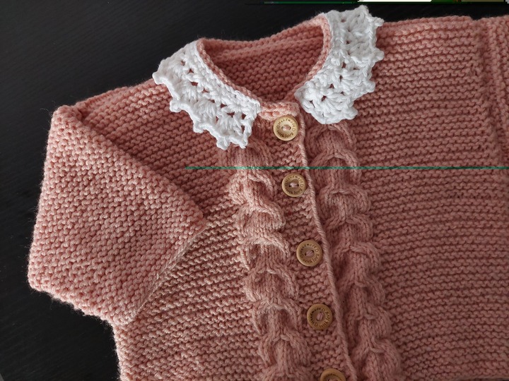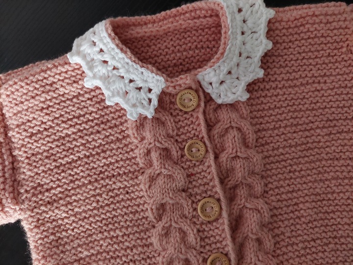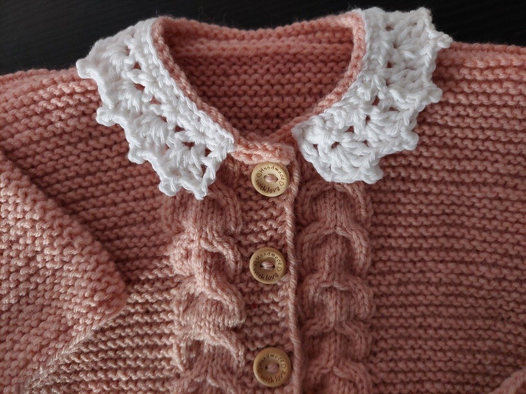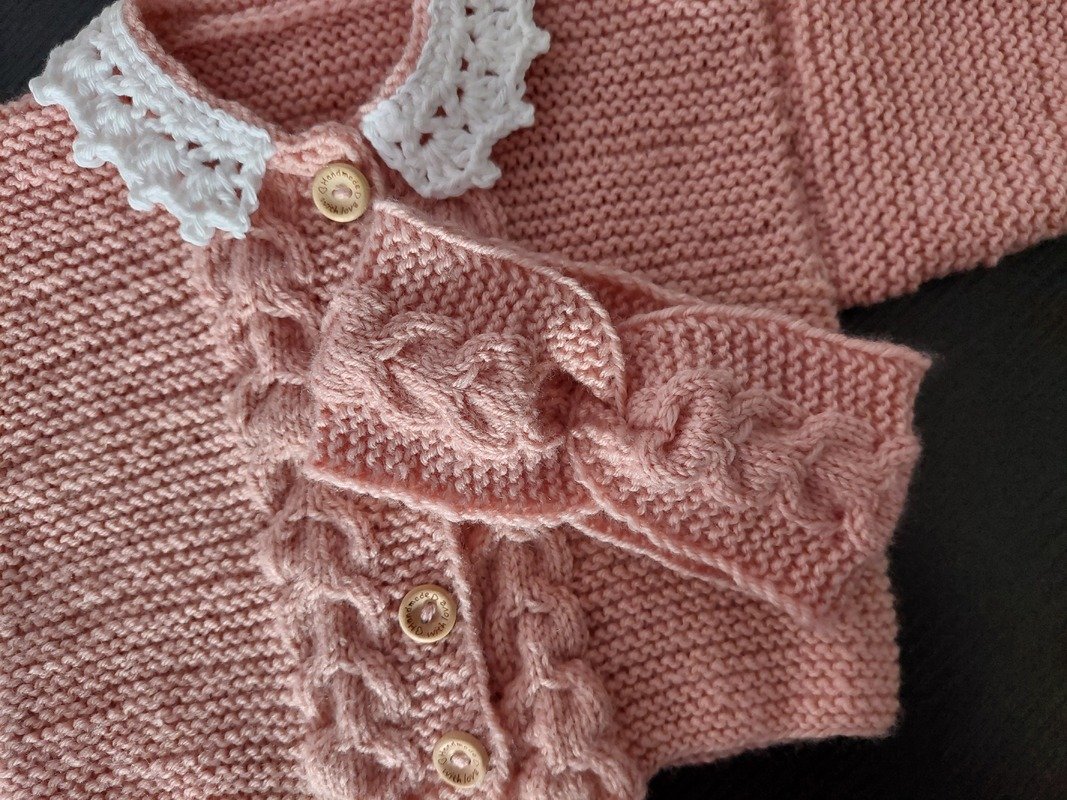 Das plastische Zopfmuster entlang der Knopfleiste setzt sich wunderschön vom weißen Häkelkragen ab und verleiht dem Set einen eleganten, klassischen Look.