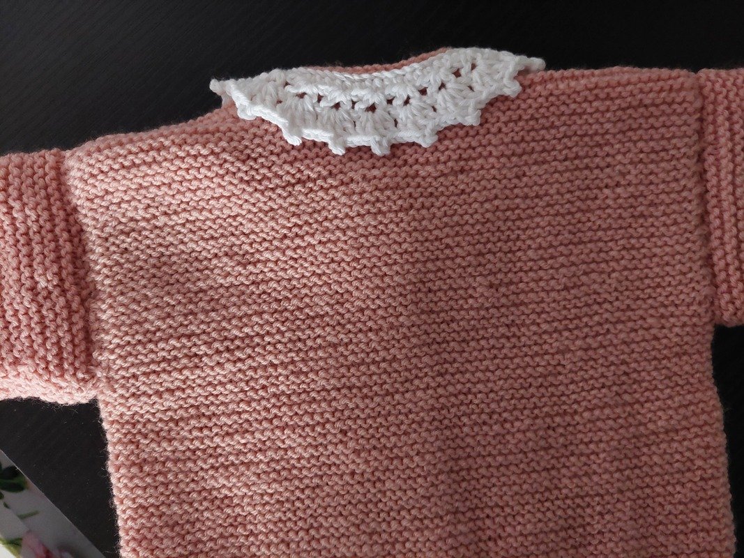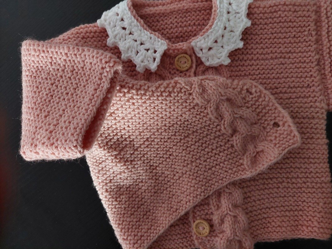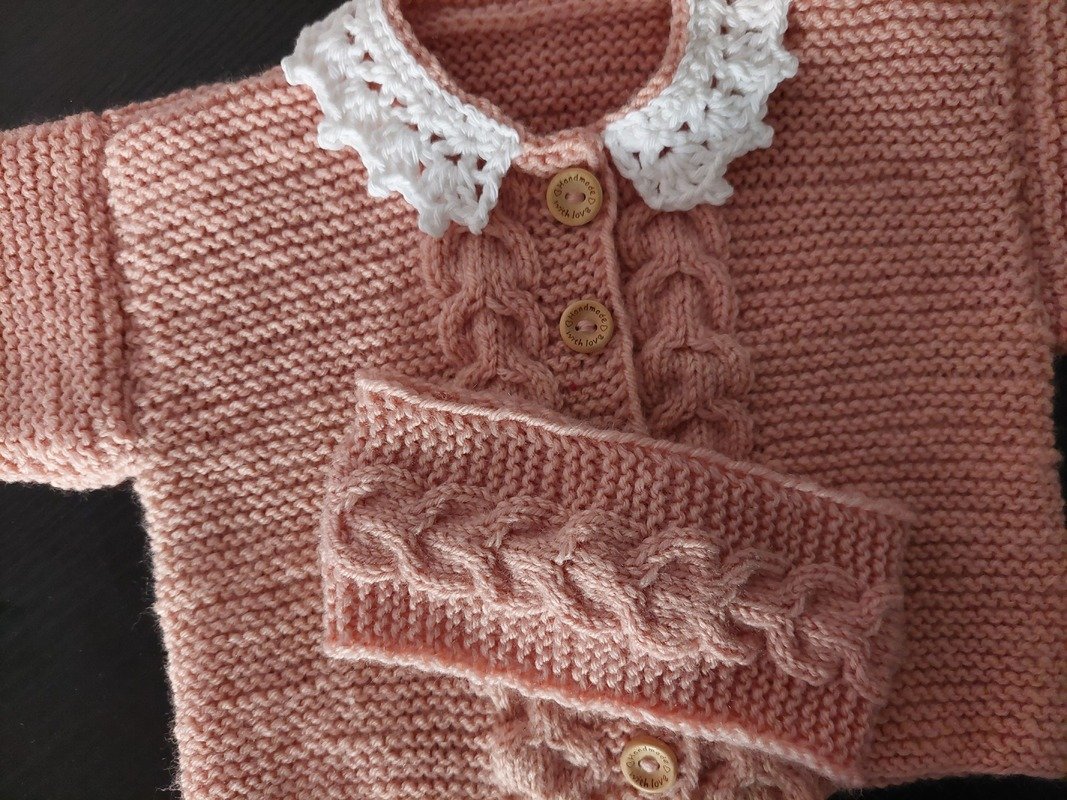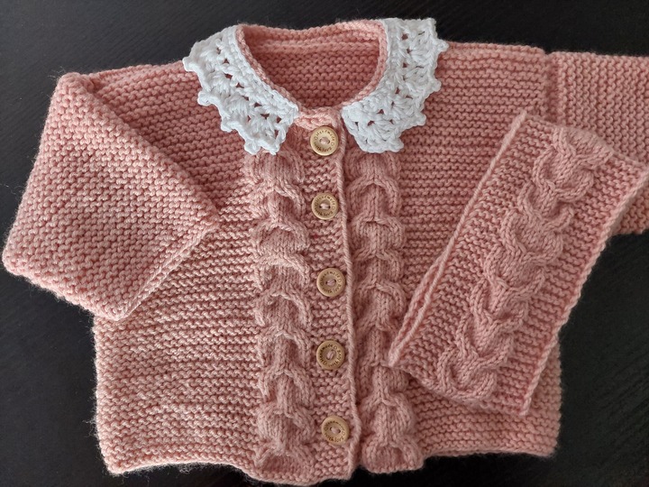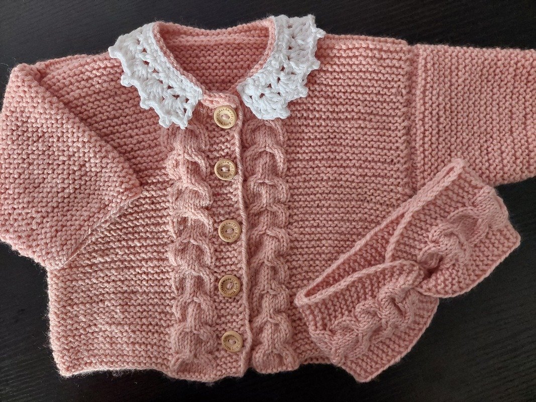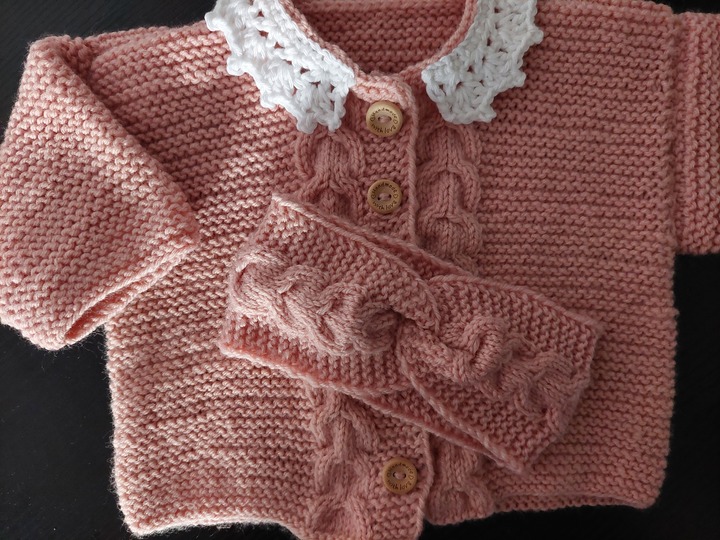 Dieses zauberhafte 2-teilige Baby-Set in sanftem Rosé besteht aus einem Jäckchen mit weißem Häkelkragen und einem dazu passenden Stirnband.