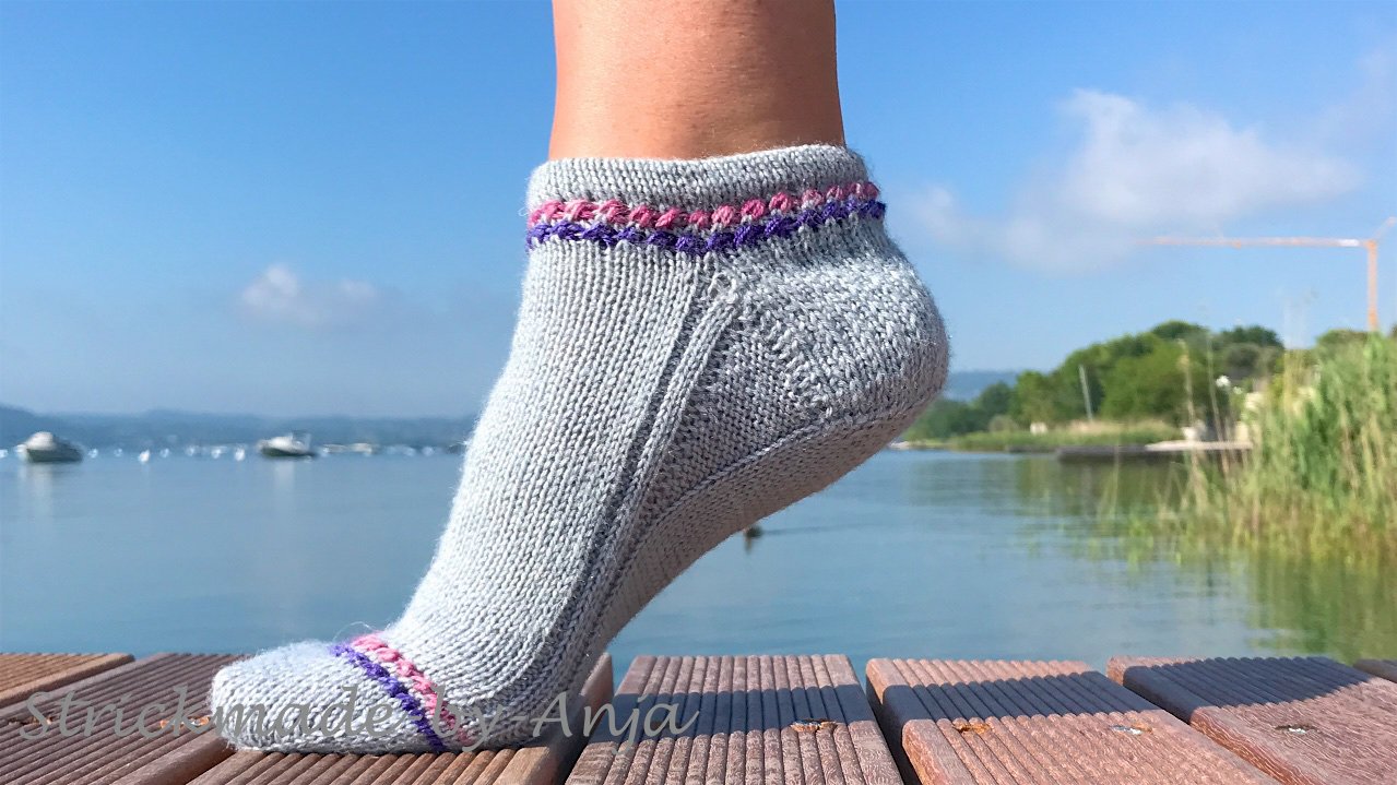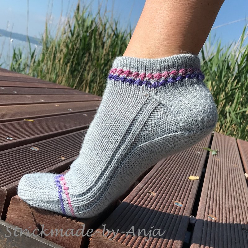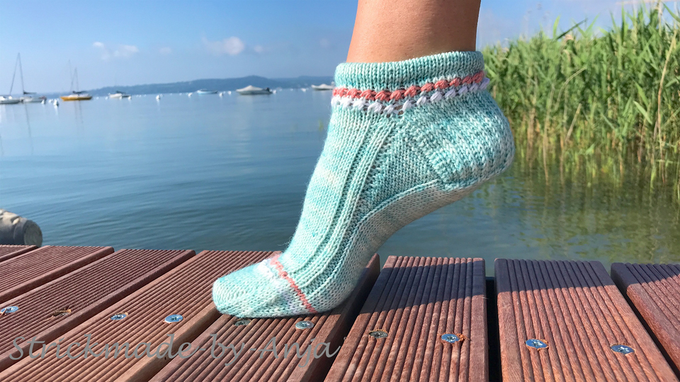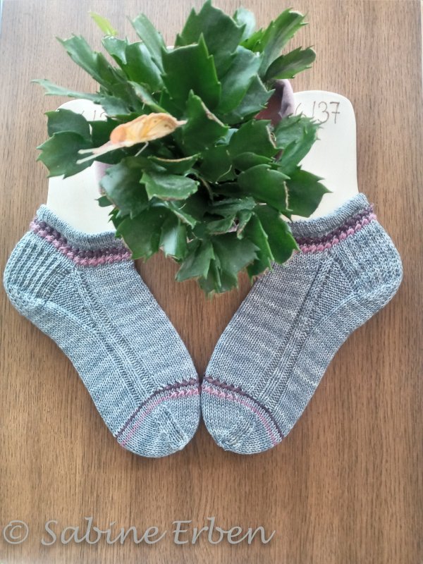Die PDF Datei enthält die Anleitung für die oben beschriebenen Sneakersocken für die Größen 36/37, 38/39 und 40/41.