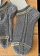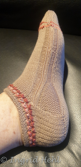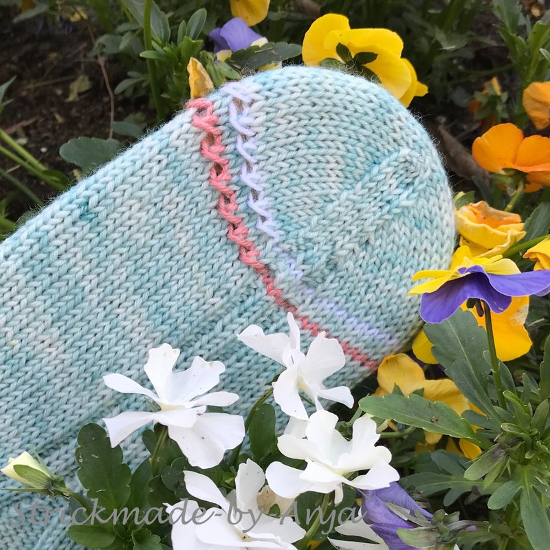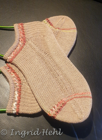 In dieser Anleitung ist das gezeigte Bündchen, die verstärkte Hufeisenferse und die Bandspitze beschrieben. Es kann aber beliebig ausgetauscht werden.