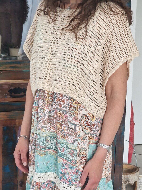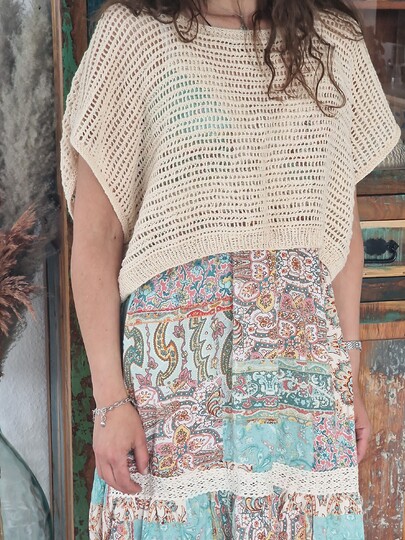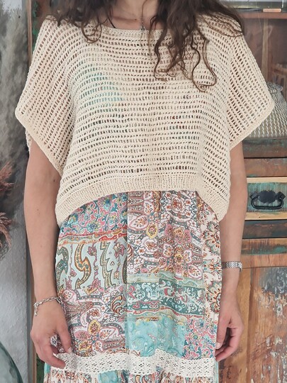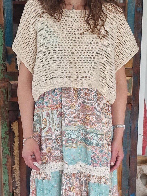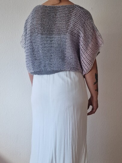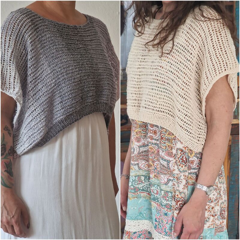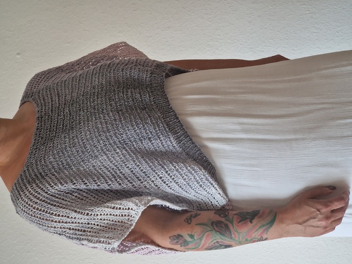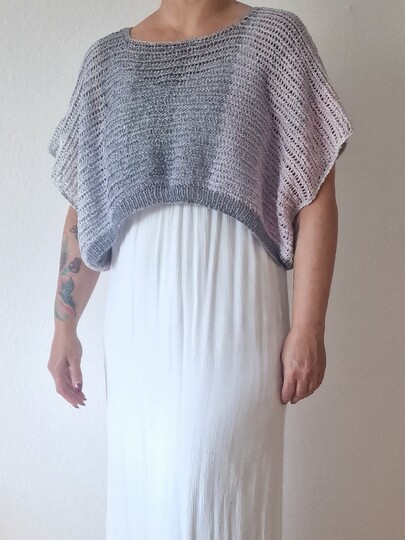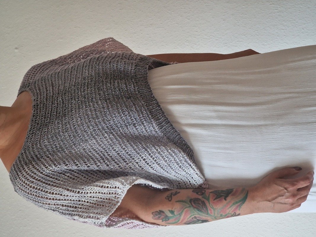 Nach dieser Anleitung kannst Du dir ein sommerliches, oversize Crop – Shirt stricken. Es ist luftig und leicht und es passt super über ein Top oder ein Kleid, wenn es abends doch mal ein bissl kühler ist, Du einfach nur was locker – lässiges zum Drüberziehen suchst oder weil Du deine Arme etwas bedeckt haben möchtest.