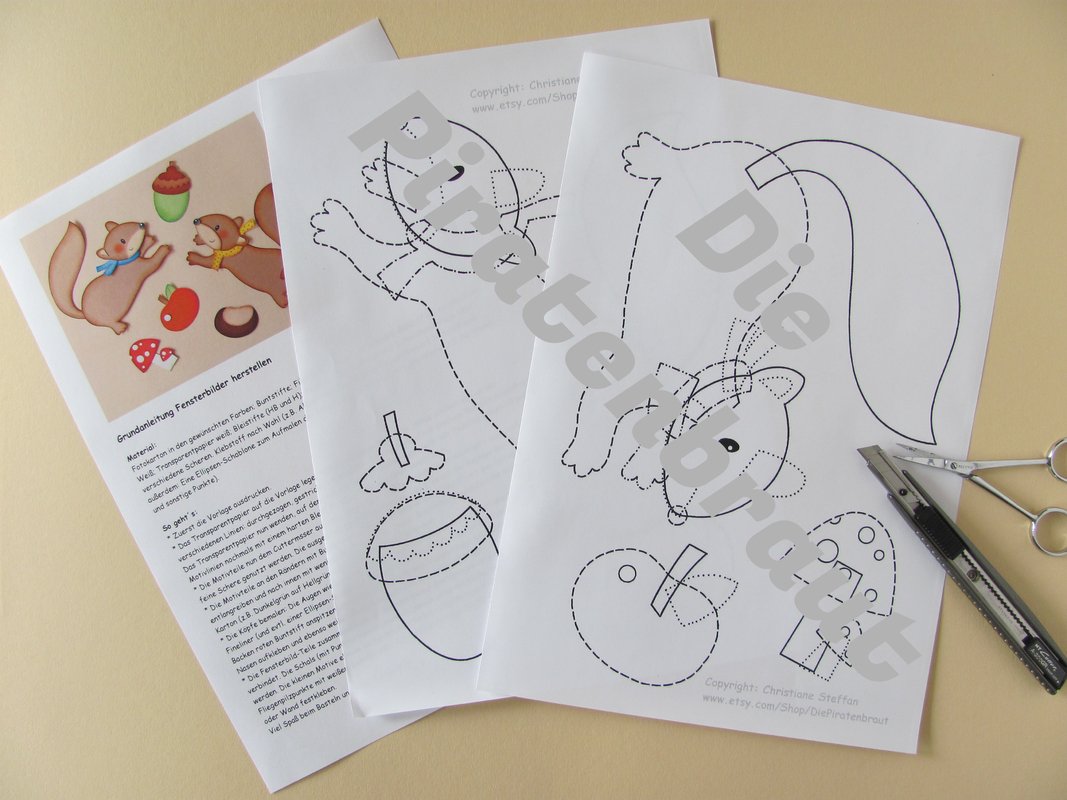 Für diese zwei quietschfidelen Eichhörnchen (sowie einigen herbstlichen Kleinmotiven zum Ergänzen) gibt es in diesem Download die Vorlagen sowie eine Grundanleitung in deutscher Sprache. Kleine Siebenschläfer bekommt man, wenn man sie in Grau bastelt. Das süsse Fensterbildmotiv ziert gerne Fenster oder Wand und ist einfach nachzuarbeiten, auch Kinder können mitbasteln.