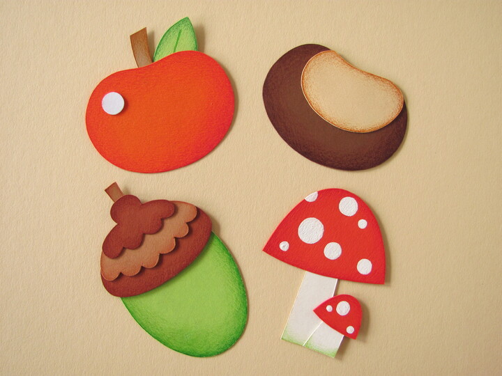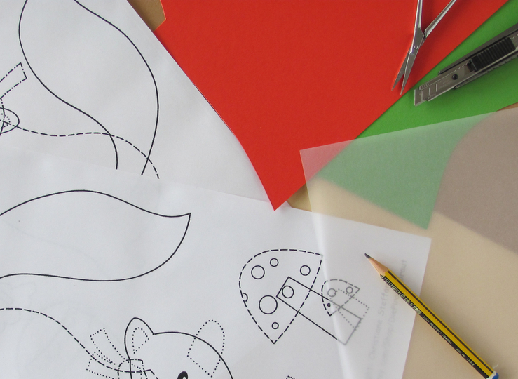 Fotokarton in diversen Farben, Buntstifte und Fineliner, Gelstift, Transparentpapier weiß, Bleistifte,Tesafilm, Cuttermesser mit Schneideunterlage oder verschiedene Scheren. Klebstoffe nach Wahl. Nützlich, wenn vorhanden, sind außerdem: Motivstanzer in Kreisform für Nasen und Pilzpunkte.