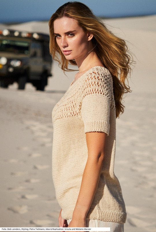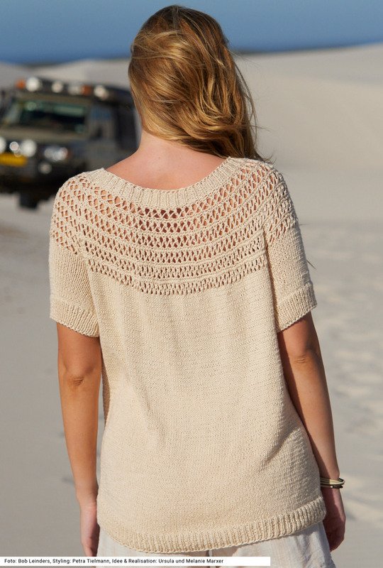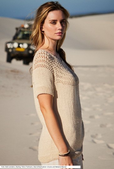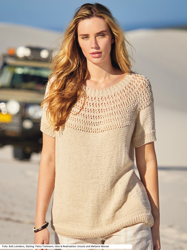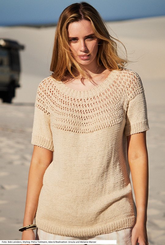 So schlicht wie schön: Dieser Kurzarmpulli mit weitem rundem Halsausschnitt zählt zu den Sommer-Basics, die oft im Einsatz sind. Bis zur Rundpasse in einzelnen Teilen einfach glatt rechts gestrickt, zieht die rundgestrickte Passe mit luftigem Lochmuster dann die Blicke auf sich. Saum-, Ärmel- und Ausschnittbündchen werden als 1/1-Rippen gearbeitet. Das Garn besteht aus weicher, anschmiegsamer Baumwolle mit etwas Polyamid-Beimischung. Wir haben für den Sommer die Farbe Natur gewählt. Eine Anleitung steht für die Größen 38/40, 42/44 und 44/48 zur Verfügung.