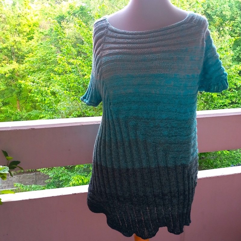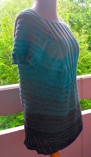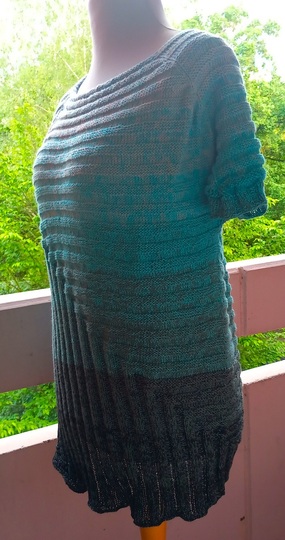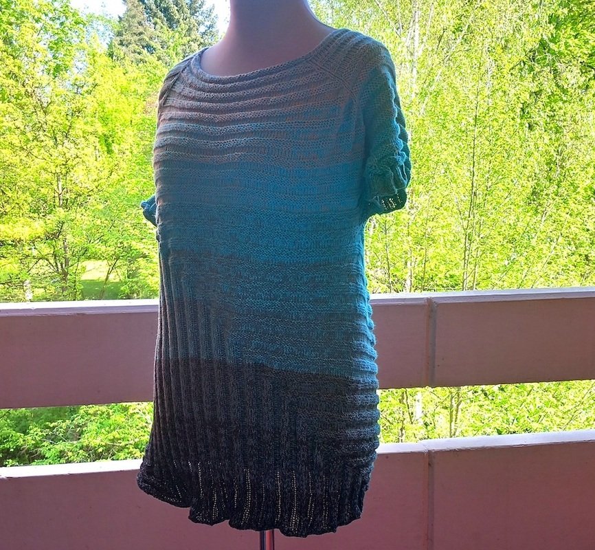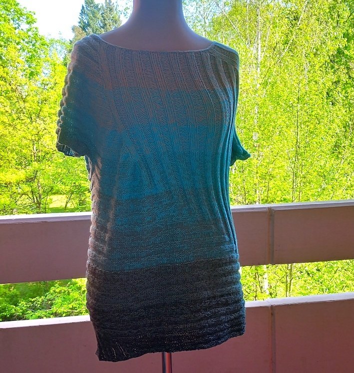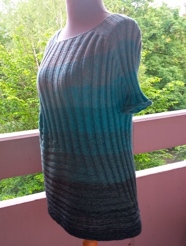 Ich hatte für etwa Damen-Größe 44 mit etwa 70 cm Länge ca. 1200 m vierfädiges Farbverlaufsgarn (TVU, 50% Baumwolle, 50 % Polyacryl) : die Elfe „Blue Eukalypso“ von Alina Dalichau (www.