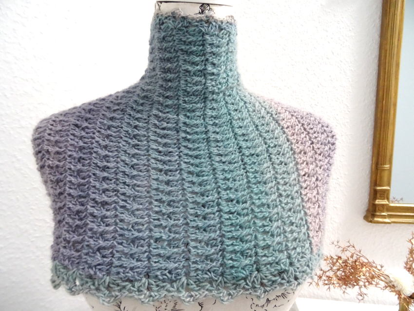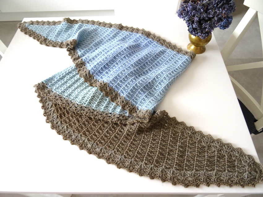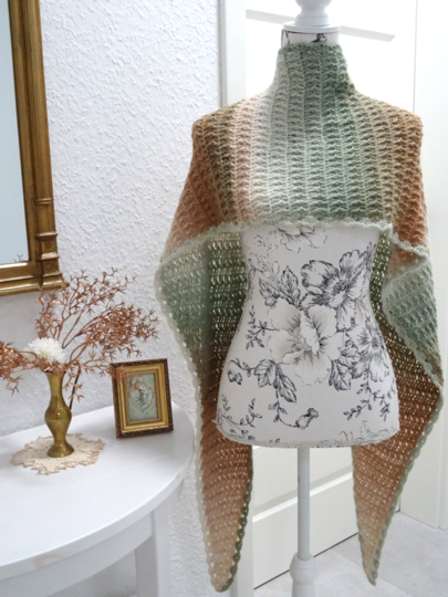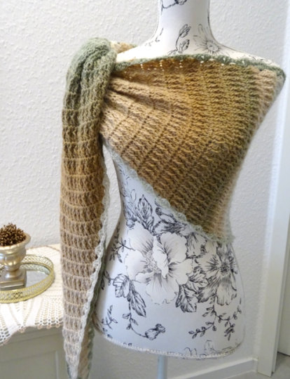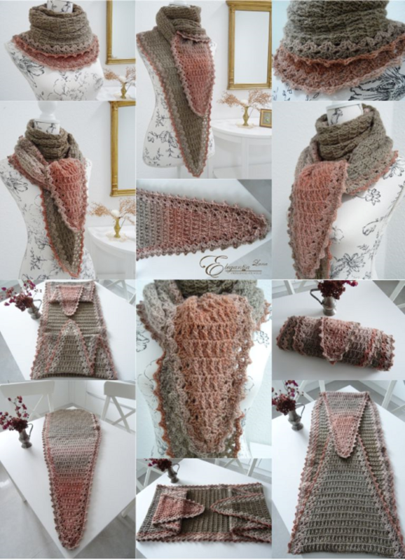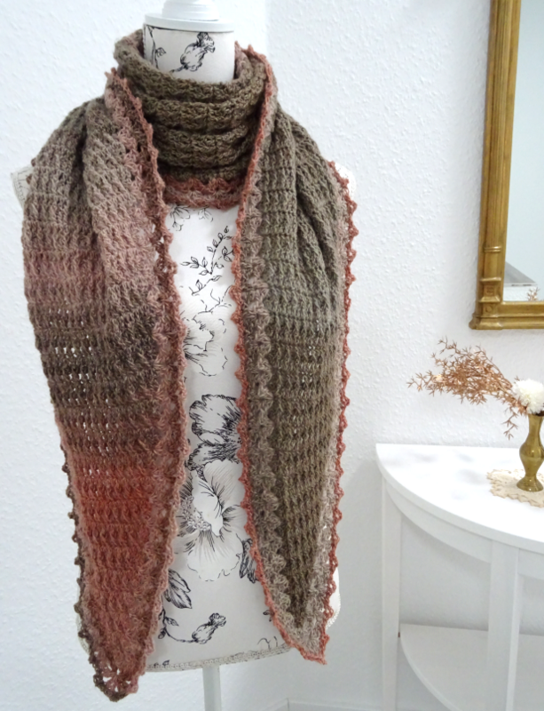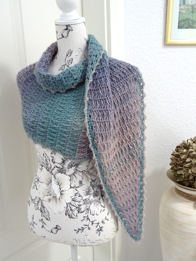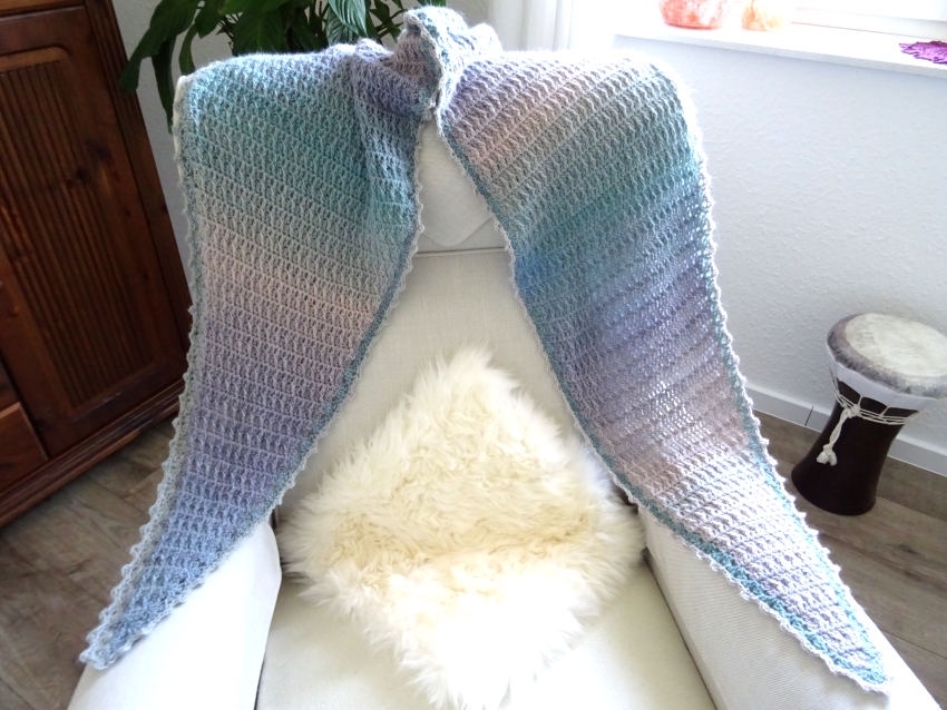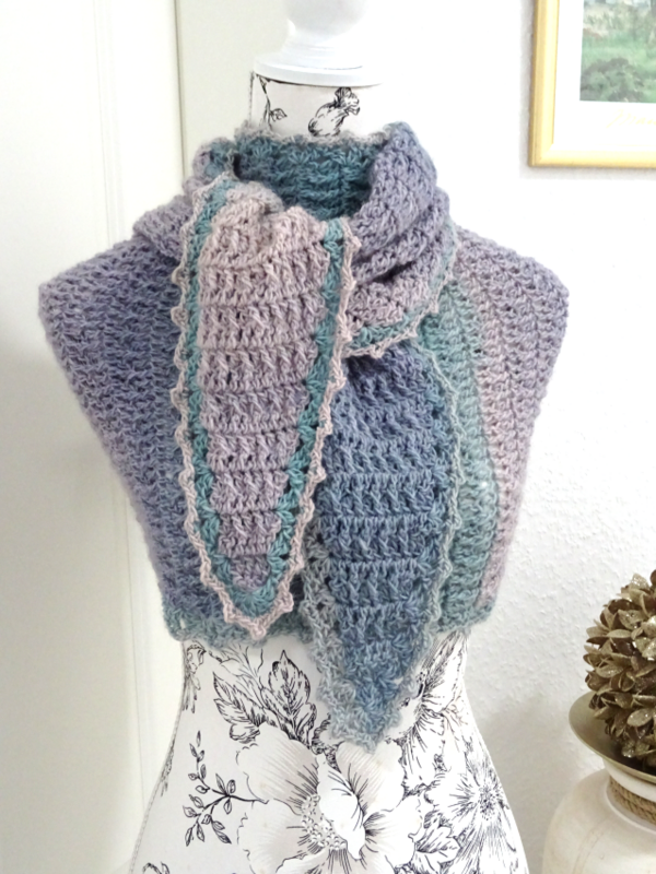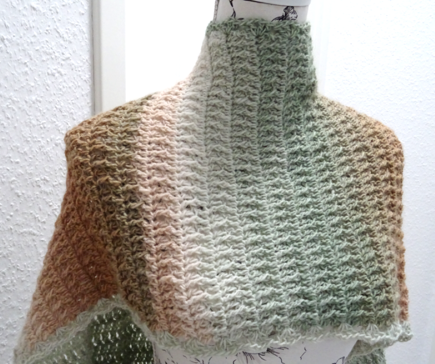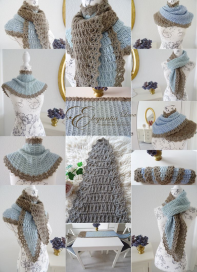 Das Schaltuch kann sowohl als Wintervariante mit dicker und flauschiger Wolle, als auch als Sommervariante mit Baumwoll-, Leinen- oder Bambusgarn für kühlere Abende gearbeitet werden. Es schmiegt sich angenehm leicht um den Hals.