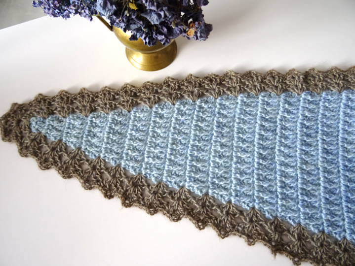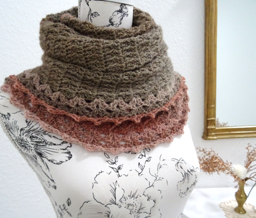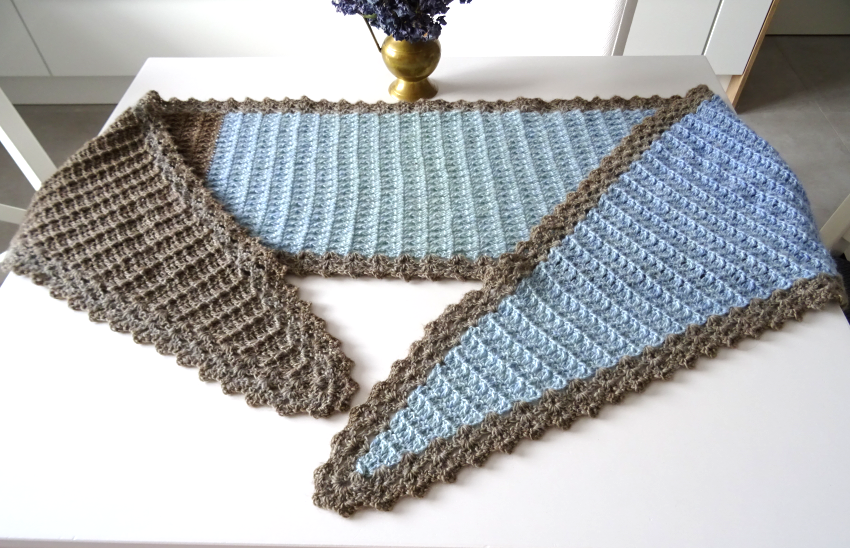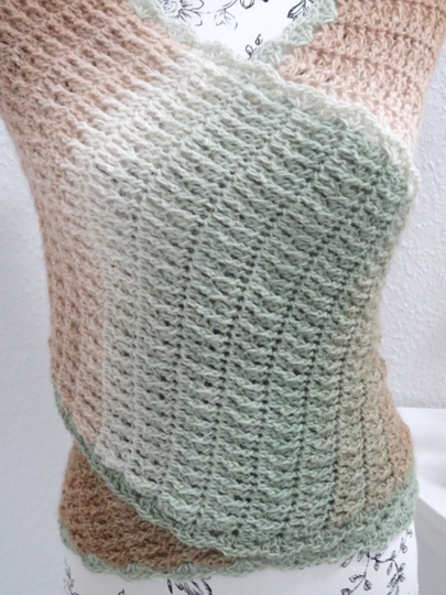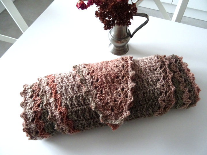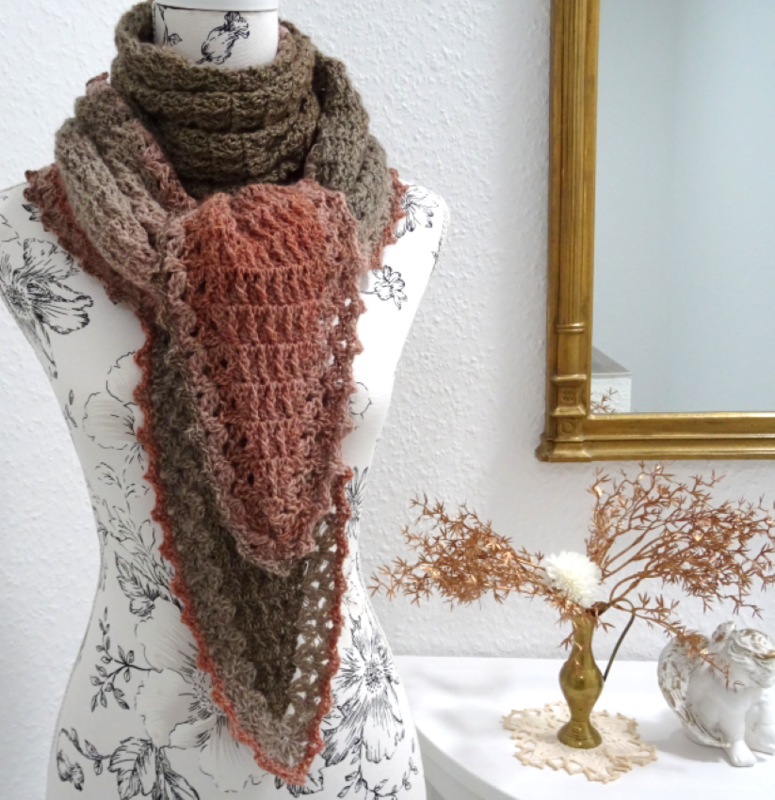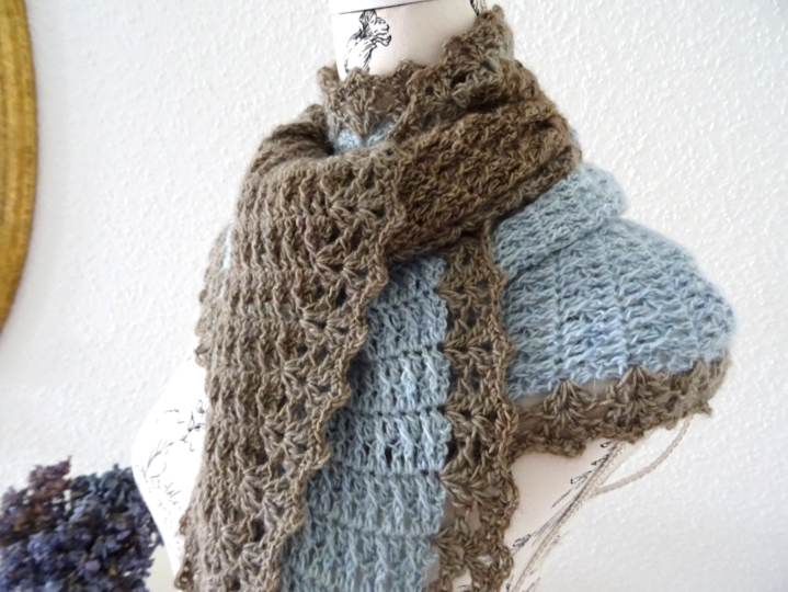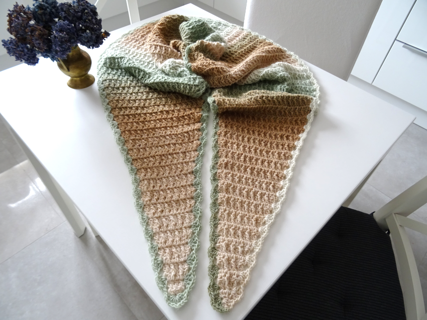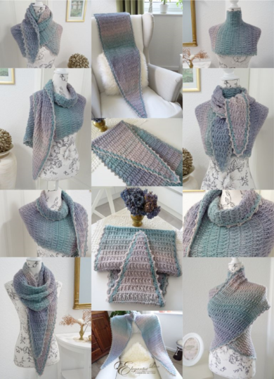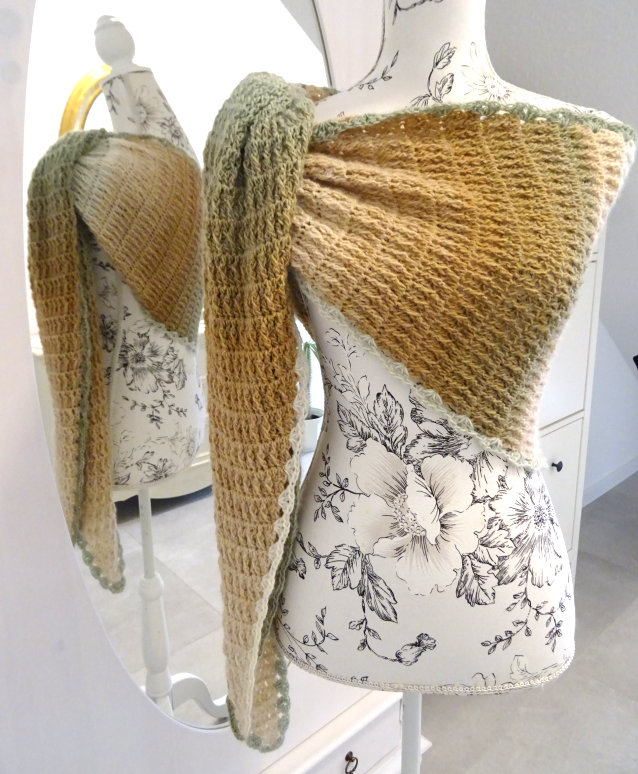Das Schaltuch kann sowohl als Wintervariante mit dicker und flauschiger Wolle, als auch als Sommervariante mit Baumwoll-, Leinen- oder Bambusgarn für kühlere Abende gearbeitet werden. Es schmiegt sich angenehm leicht um den Hals.