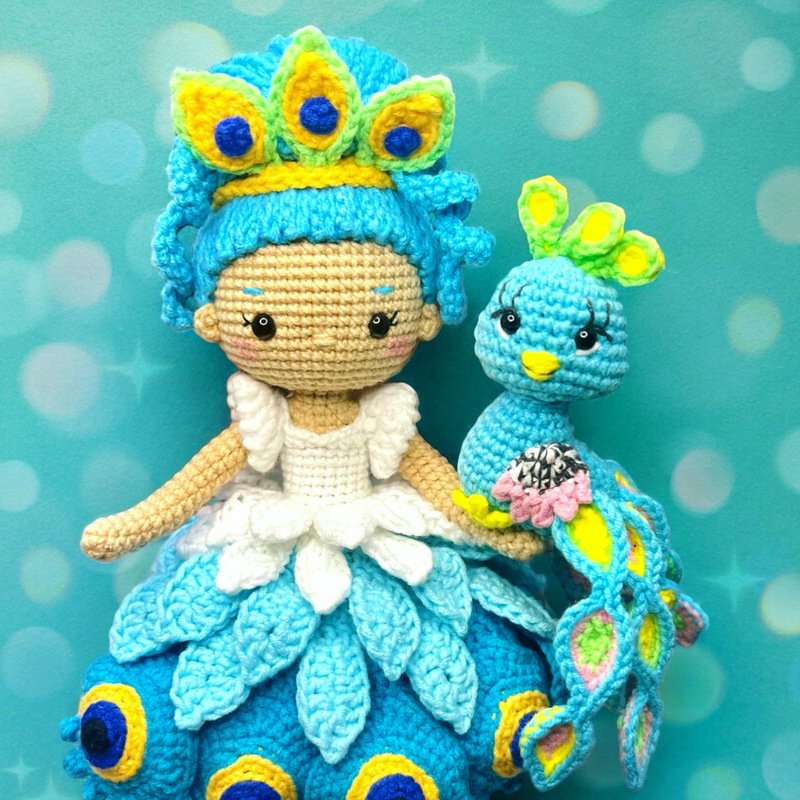 Dies ist die Original-Anleitung von Penny, dem Pfauen-Mädchen, geschrieben und entworfen von Yevheniia Romanchuk (LovenikaDesign).