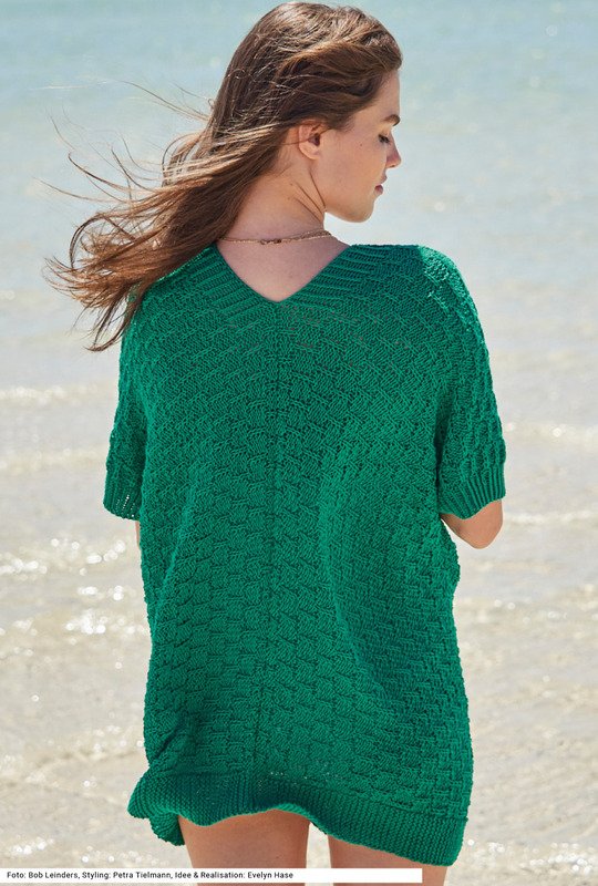 Fröhliches Sommerflair versprüht dieses Set aus reiner Baumwolle, das aus einer verschlusslosen Jacke plus Trägertop besteht. Das einfache Strukturmuster des Tops wird mit einem Farbverlaufsgarn, das von unterschiedlichen Grüntönen bis Nachtblau changiert, gestrickt. Die Jacke – ebenfalls im selben Strukturmuster – hingegen ist uni in Smaragdgrün gehalten, sodass das Ensemble auch bürotauglich ist. Sie wird in zwei Teilen quer gearbeitet und einfach in der Rückenmitte zusammengenäht. Bündchen und Blenden bestehen aus 1/1-Rippen. Eine Anleitung für die Größen 38/40, 42/44 und 46/48 steht zum Download bereit.