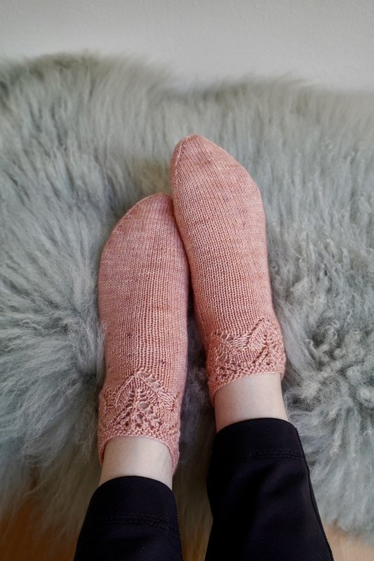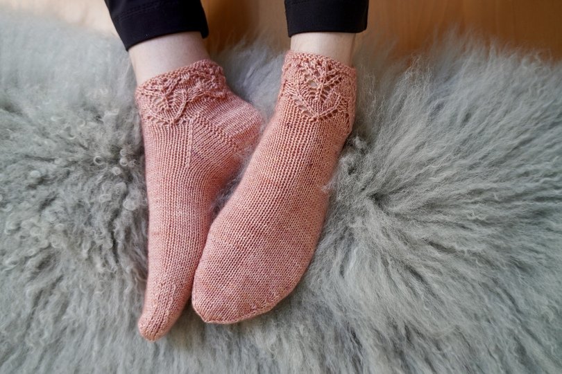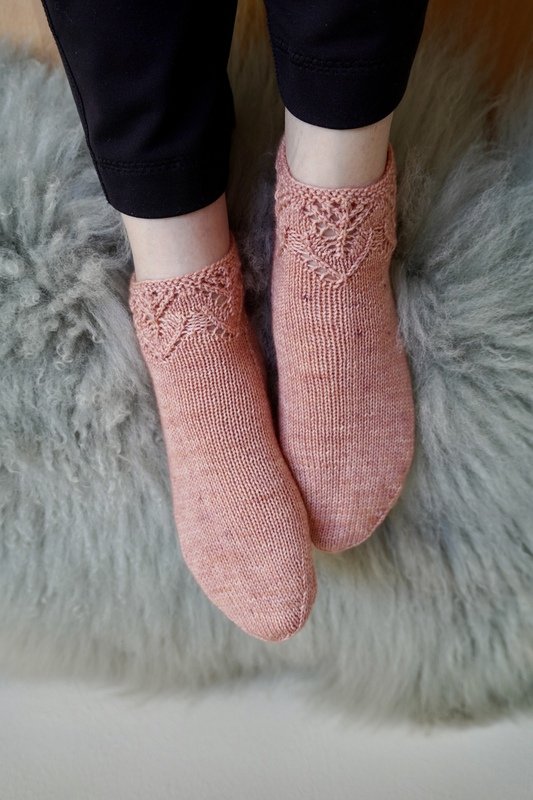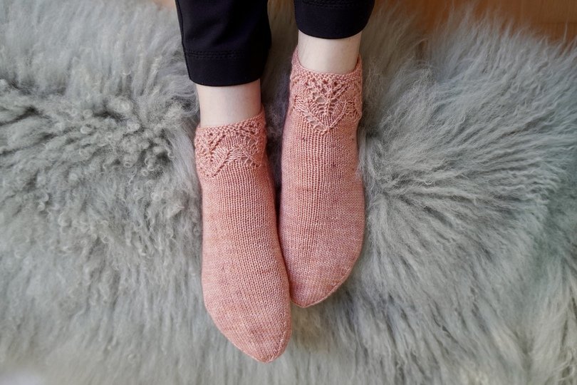 Hier gibt das "Bündchen" bzw. der gemusterte kurze Schaft mit Lochmuster den Ton an! Gestrickt wird von oben nach unten, also vom Schaft in Richtung Fußspitze. Die Herzchenferse ist beschrieben, Du kannst aber auch problemlos Deine Lieblingsferse "einbauen". Der Fuß wird ganz entspannt glatt rechts gestrickt und endet mit einer gerundeten Bandspitze.
