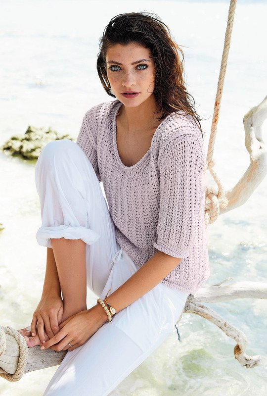 Dieses Modell ist ein echter Klassiker. Der schicke Rundausschnitt, die ¾-Armlänge und der gerade Schnitt machen ihn zu einem tollen Sommerbegleiter. Das glatte Baumwollgarn sorgt für luftige Frische und ist von RICO-DESIGN. Das Hebemaschenmuster gibt Struktur. Alle Teile werden einzeln von unten nach oben gestrickt und schließlich zusammengenäht. Die Blende wird für einen sauberen Abschluss ganz am Ende um den Halsausschnitt angebracht. Gestrickt wird Nadelstärke 7 und 8. So ist der Pulli schnell fertig und kann ausgeführt werden. Die Anleitung enthält die Größen 38/40 und 44/46 und du kannst direkt mit dem Nacharbeiten loslegen.