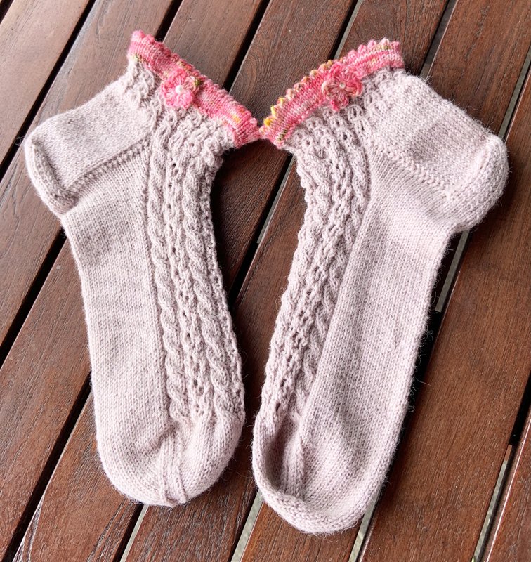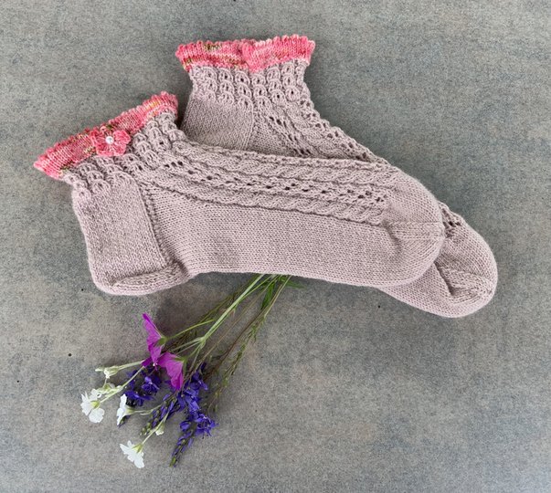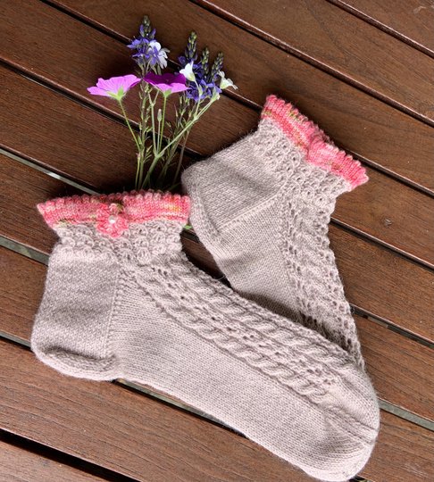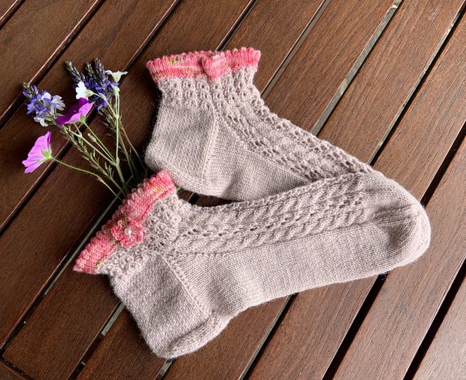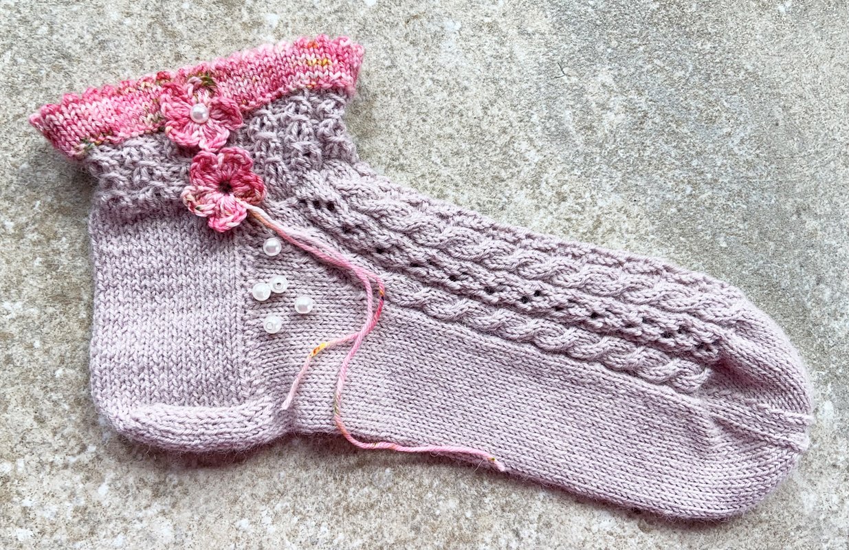 Sneakersöckchen gehören zum Sommer. Hier kann man eines mit Mausezähnchenrand und einfachen Loch- und Zopfmustern nachstricken. Zum Schluss wird noch ein einfaches Häkelblümchen mit Perle am Rand festgenäht.