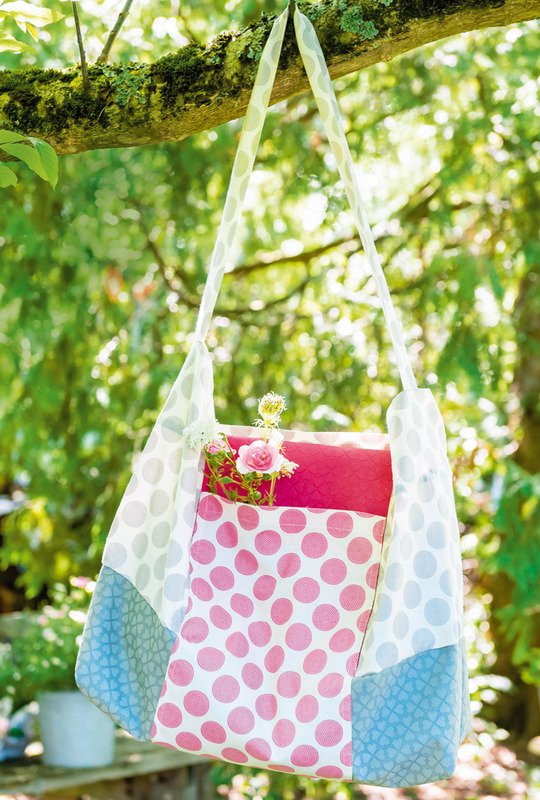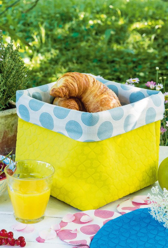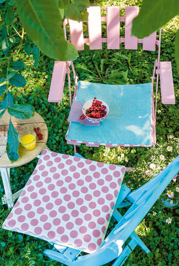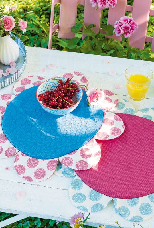 Ein bisschen Farbe macht uns glücklich. Diese Tasche und die fröhliche Tischdeko zum geselligen Beisammensein draußen auf dem Balkon oder im Garten aus vielen farbenfrohen Stoffen sorgt sicher für Glücksgefühle. Die Stuhlkissen haben zwei Gesichter – auf der einen Seite unifarben und auf der anderen gepunktet. So kann man sich seine Lieblingsseite je nach Laune aussuchen! Die Platzsets in Blumenform und das sonnengelbe Brot-Körbchen sorgen garantiert für gute Laune.
