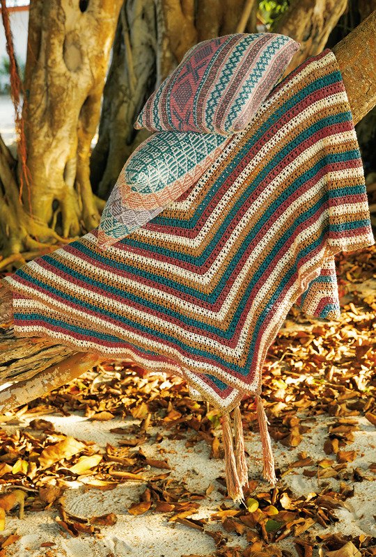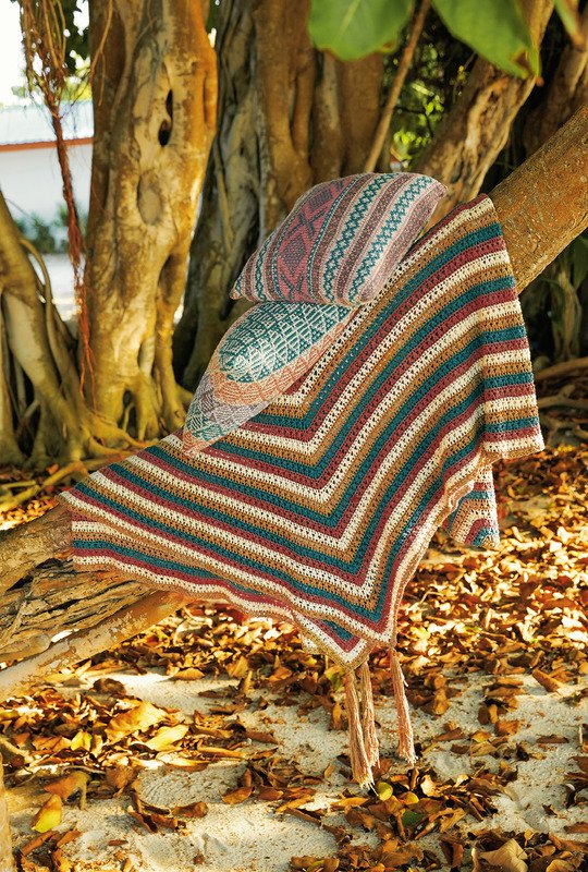 Der Boho-Style ist voll dein Ding? Du hast richtig Spaß an Mustern und bunten Farben? Du liebst es, deinem Zuhause eine ganz eigene Note zu geben? Dann sind diese tollen Projekte genau das richtige für dich. Mit dem Download bekommst du die Anleitungen für alle drei Projekte. Die Kissen werden jeweils aus einem super angenehmen Baumwollmischgarn mit Nadelstärke 4 gestrickt. Dabei wird Kissen A mit einem Jaquardmuster und Kissen B mit einem Hebemaschenmuster gearbeitet. So kommt keine Langeweilse auf und du kannst die wunderschönen Mustereffekte so richtig genießen. Die Decke wird in Runden gehäkelt und schließlich an den Ecken mit Quasten versehen. Sehr schick!