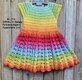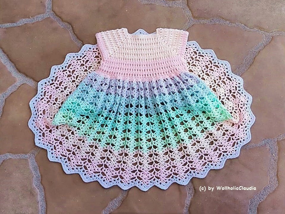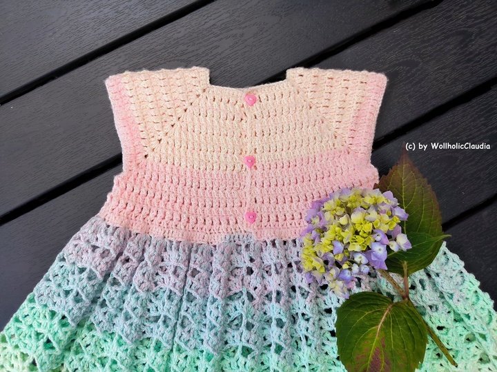 Es ist ein wunderschönes, luftiges Sommerkleidchen, dass an einem Stück von oben nach unten gearbeitet wird (Raglan von oben) und somit perfekt geeignet ist für Farbverlaufsgarne. Im Rücken befindet sich eine Knopfleiste, die mit beliebig vielen Knöpfen bestückt werden kann.
