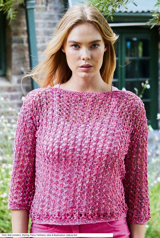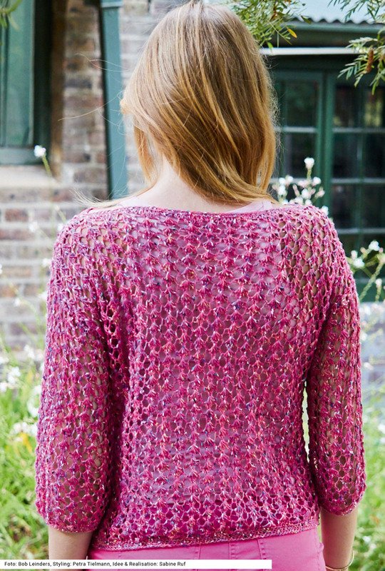 Das Netzmuster dieses Pullis ist nicht besonders schwer und auch der Schnitt – nur Rechtecke – ist ganz simpel. Der U-Boot-Ausschnitt wird mit ein paar Reihen fester Maschen etwas zusammengehalten. Auch die Bündchen sind so gehäkelt. So entsteht ein luftiger, farbenfroher Pullover, dessen pinkfarbenes Garn nicht einfach unifarben ist, sondern es hat auch noch bunte Nöppchen. Das Garn aus Baumwolle, Viskose und Synthetik hat eine lange Lauflänge, sodass nur wenig Garn gebraucht wird. Die Anleitung dazu gibt es für die Größen 36/38, 40/42 und 44/46.