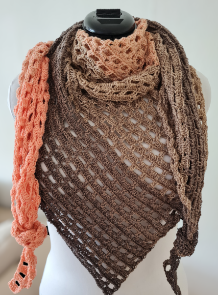 Das Tuch besteht aus 2 einfachen, sich wiederholenden Musterreihen und lässt sich somit leicht und schnell häkeln. Das besondere: Die seitlichen Schenkel des Dreieckstuch haben unterschiedliche Randabschlüsse.